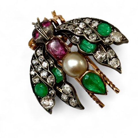 Ca 1880 probably French gold “bug” brooch set with diamonds, emeralds, rubies and one natural pearl.