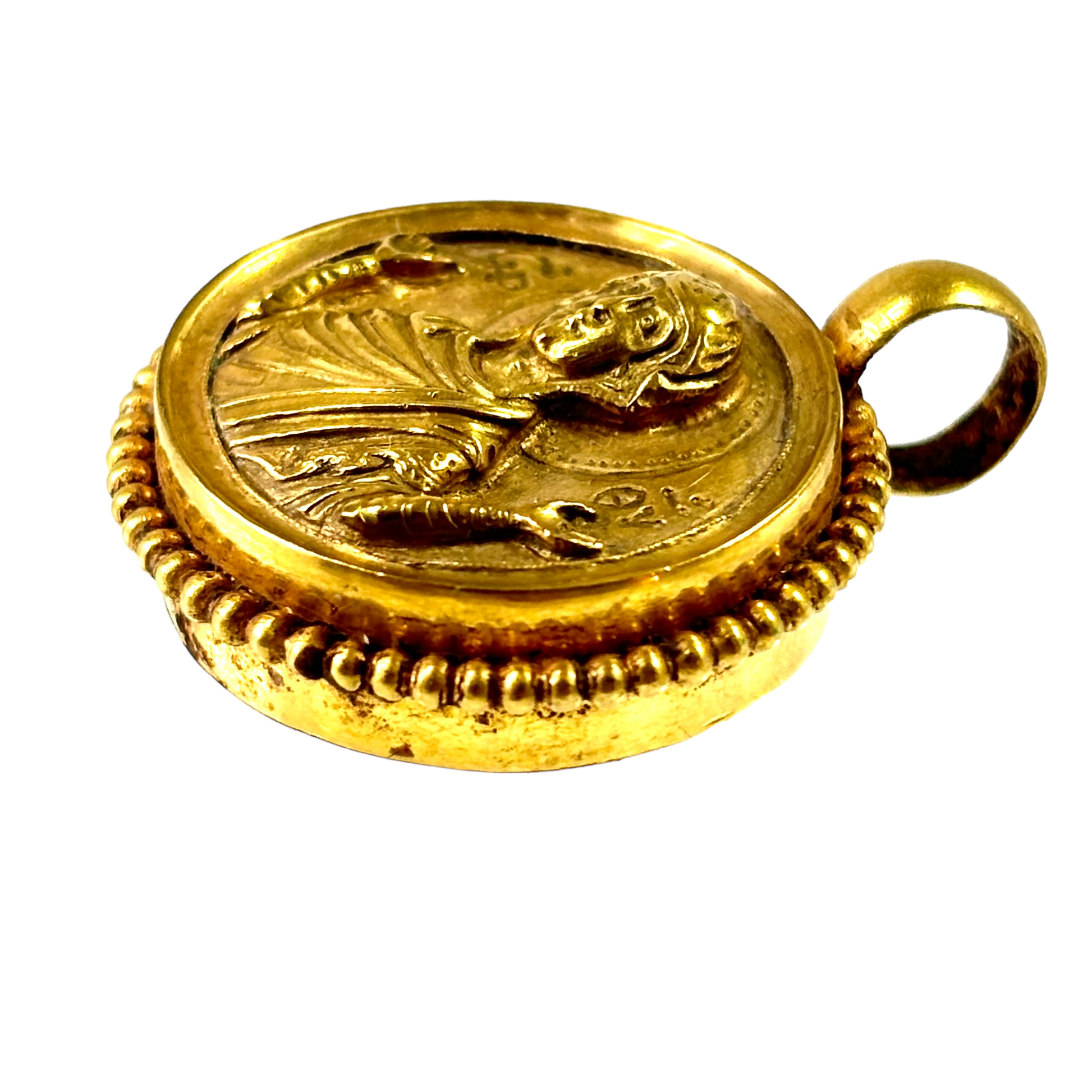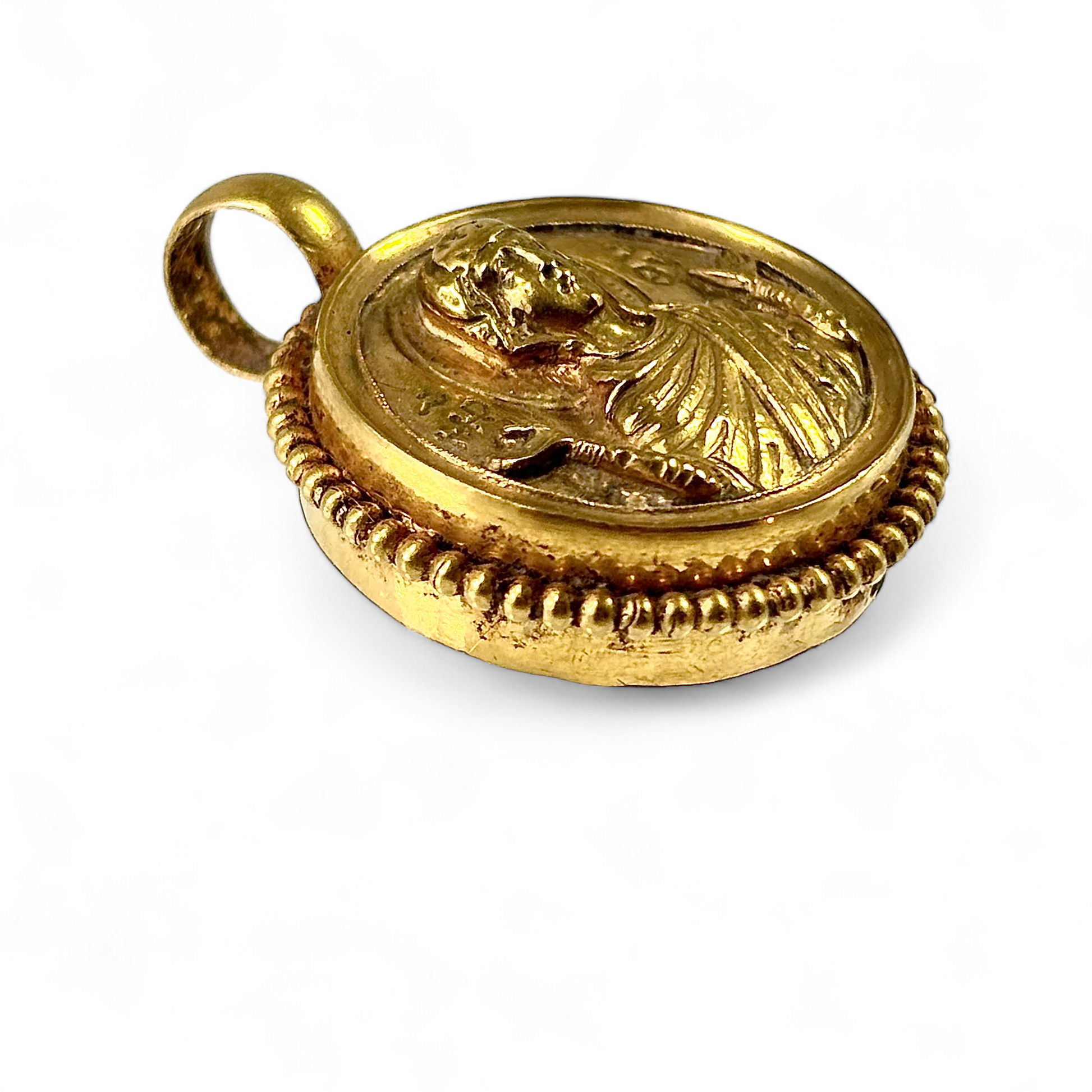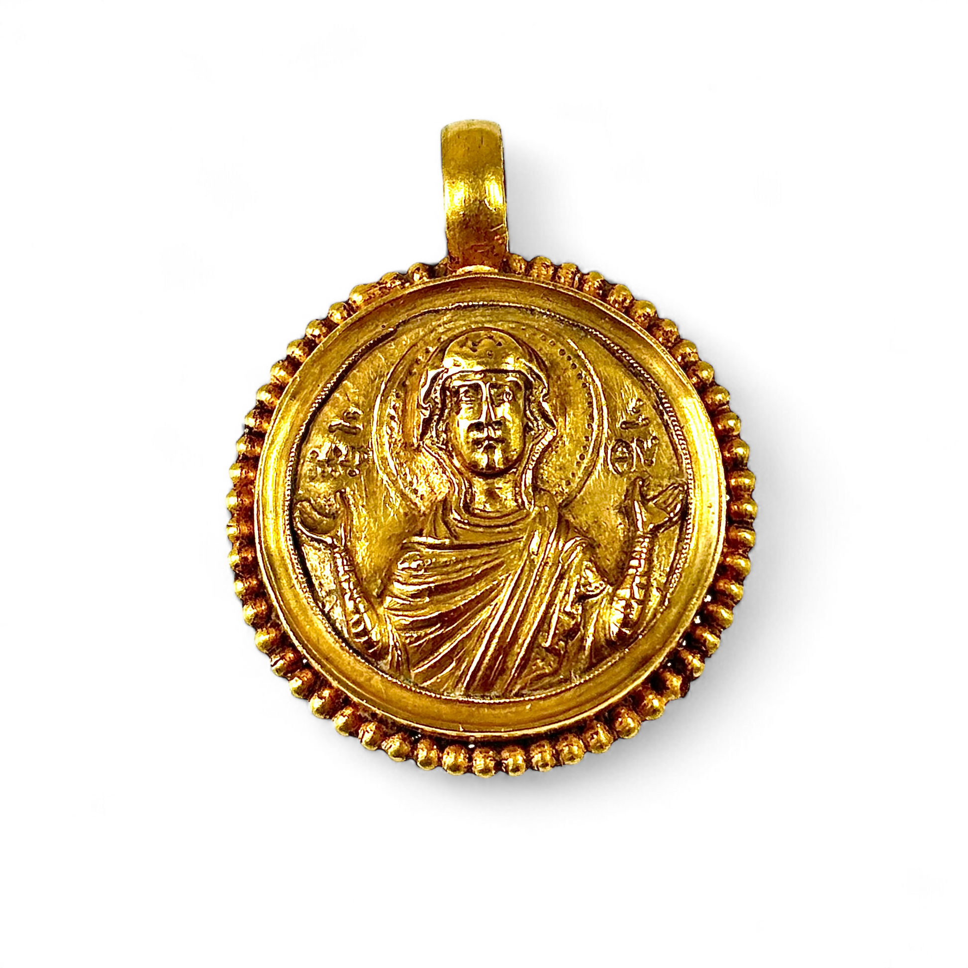 22 carat gold chased and repoussed hollow gold pendant depicting Mary mother of God . Byzantine ca 1100 A.D.