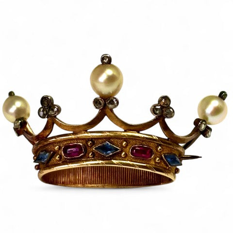 Gold brooch in the form of a crown, set with rubies and sapphires and diamonds and natural pearls.England ca 1860