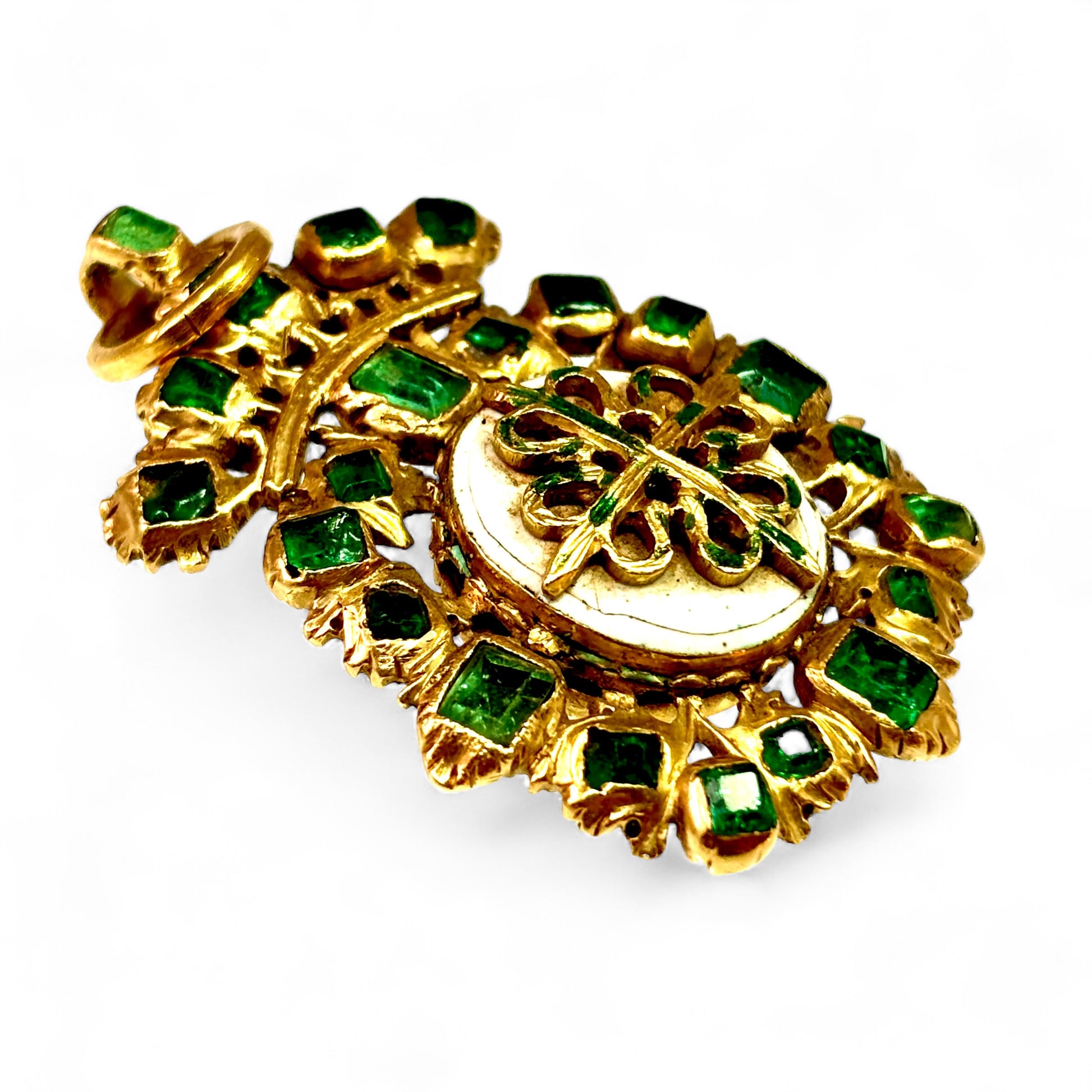 Mid seventeenth century enamelled gold pendant with the Spanish cross of Calatrava. The pendant is set with Colombian emeralds. The back of the pendant is engraved. Spain ca 1650.
