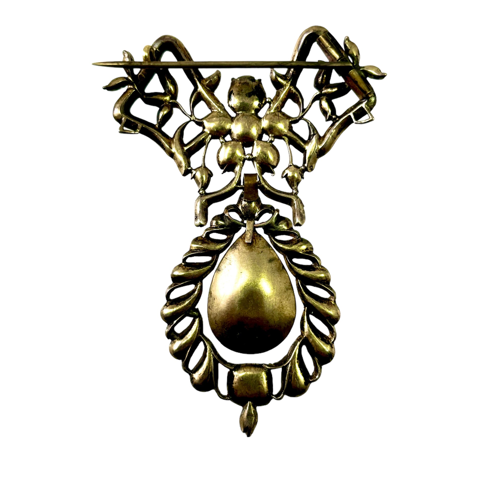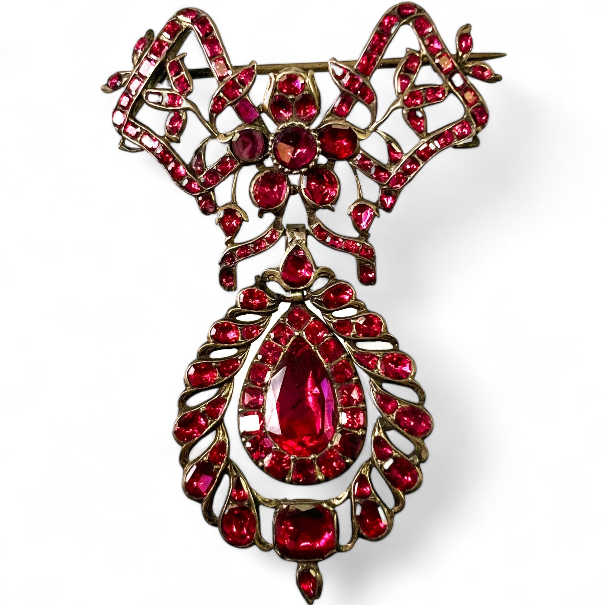 English ca 1800 silver brooch/pendant set with flat cut and foiled almandine garnets.. Originally probably part of a necklace.