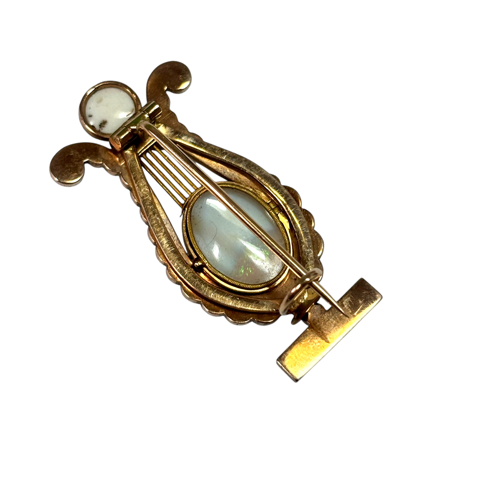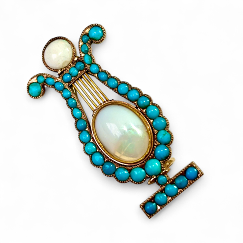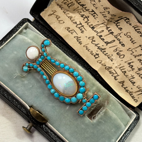 “Small” gold brooch ca 1820-30 England, set with two opals and turquoise, with a small locket in the back, together with a small handwritten note.