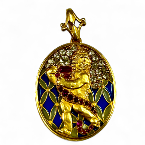 Gold pendant ca 1910 with Eros holding a horn of plenty made of rubies, and the abundance is made of diamonds. The pendant is with plaque-a-jour enamel. By Masriera of Barcelona. Comes with a letter from the current shop authenticating it.