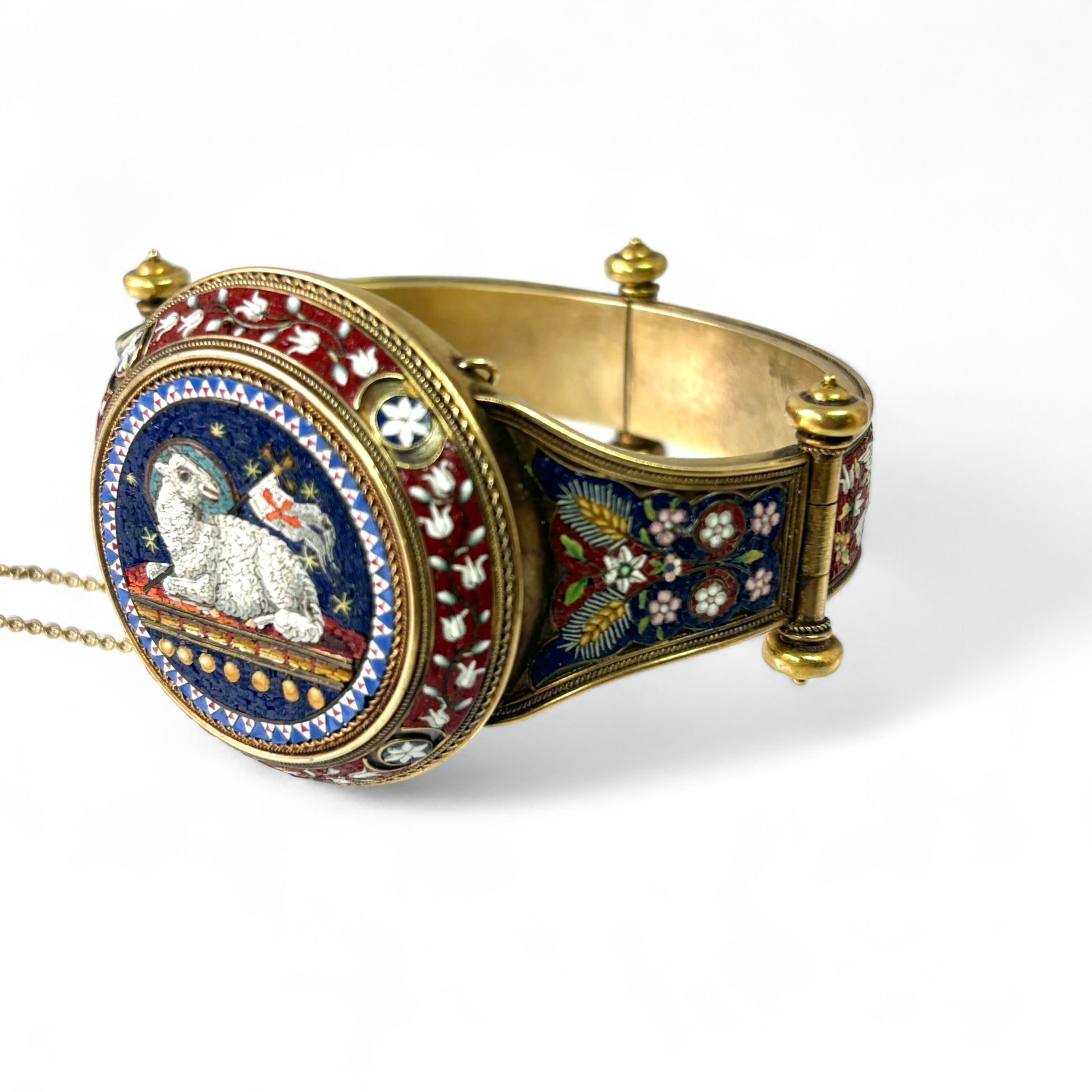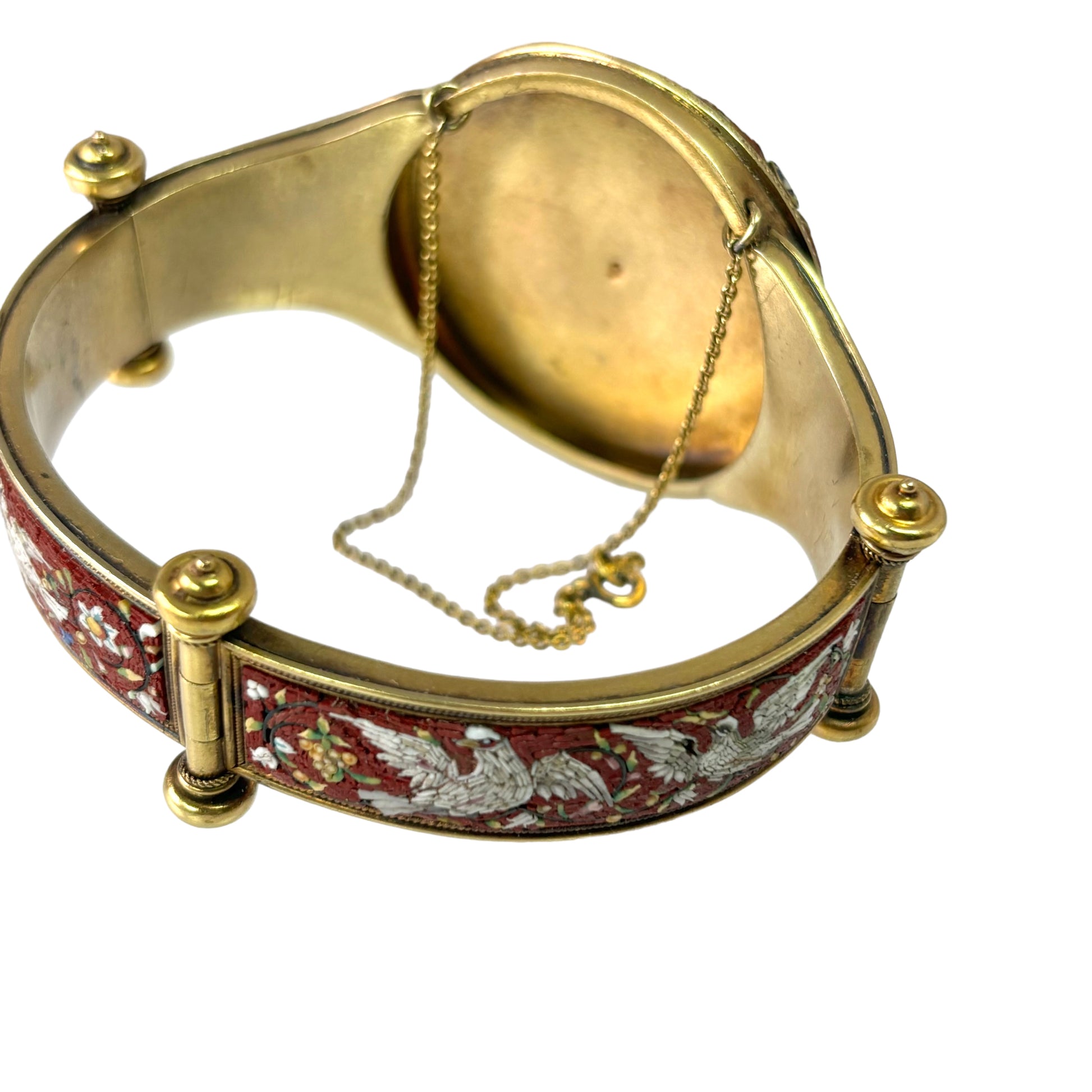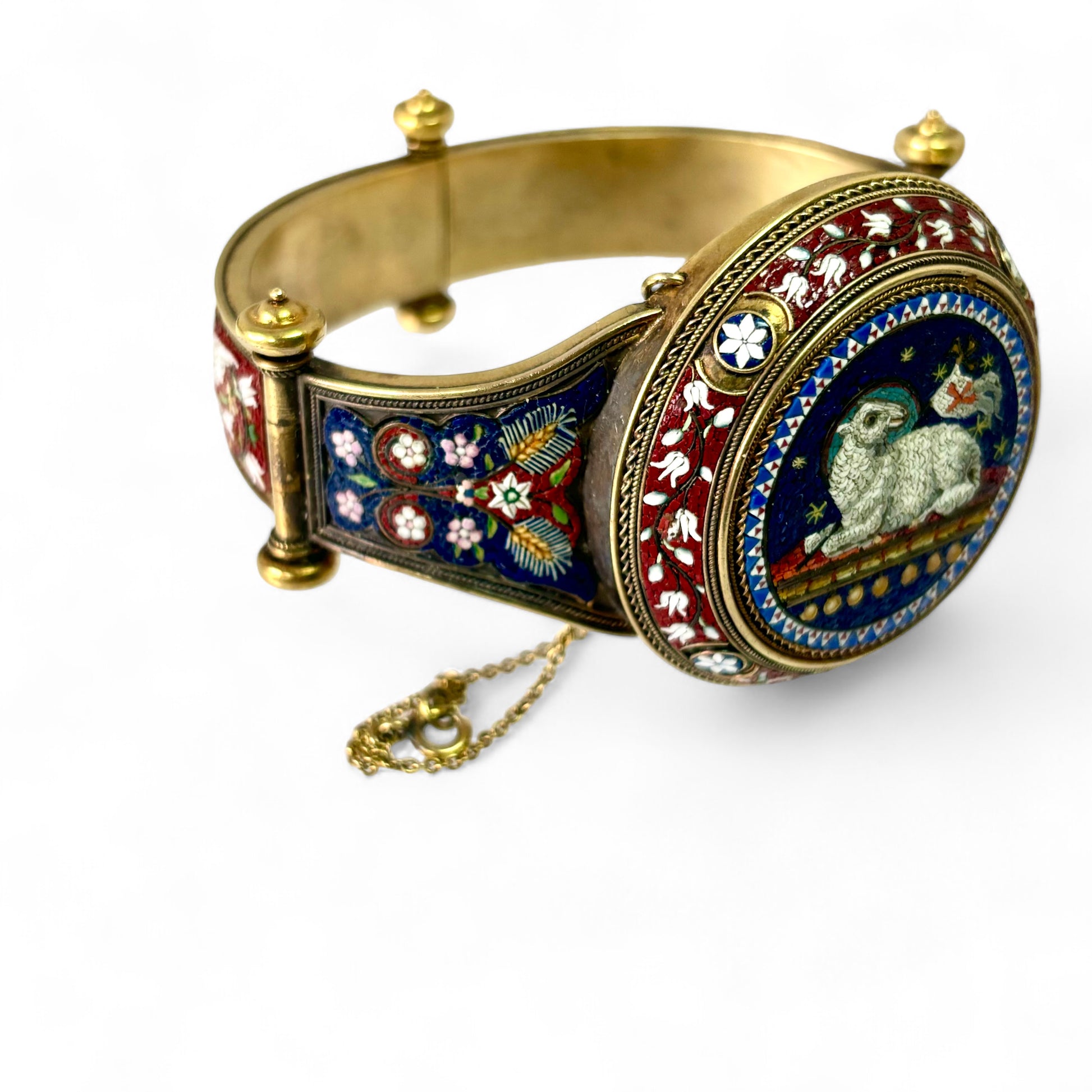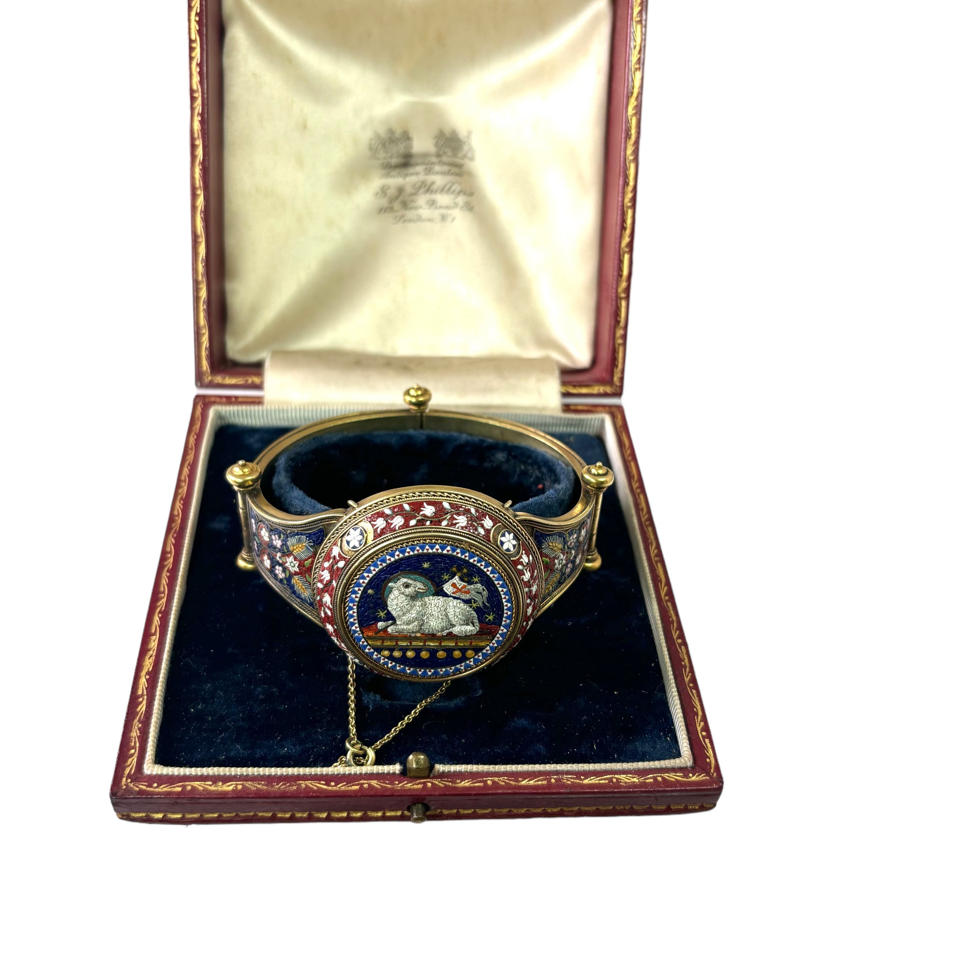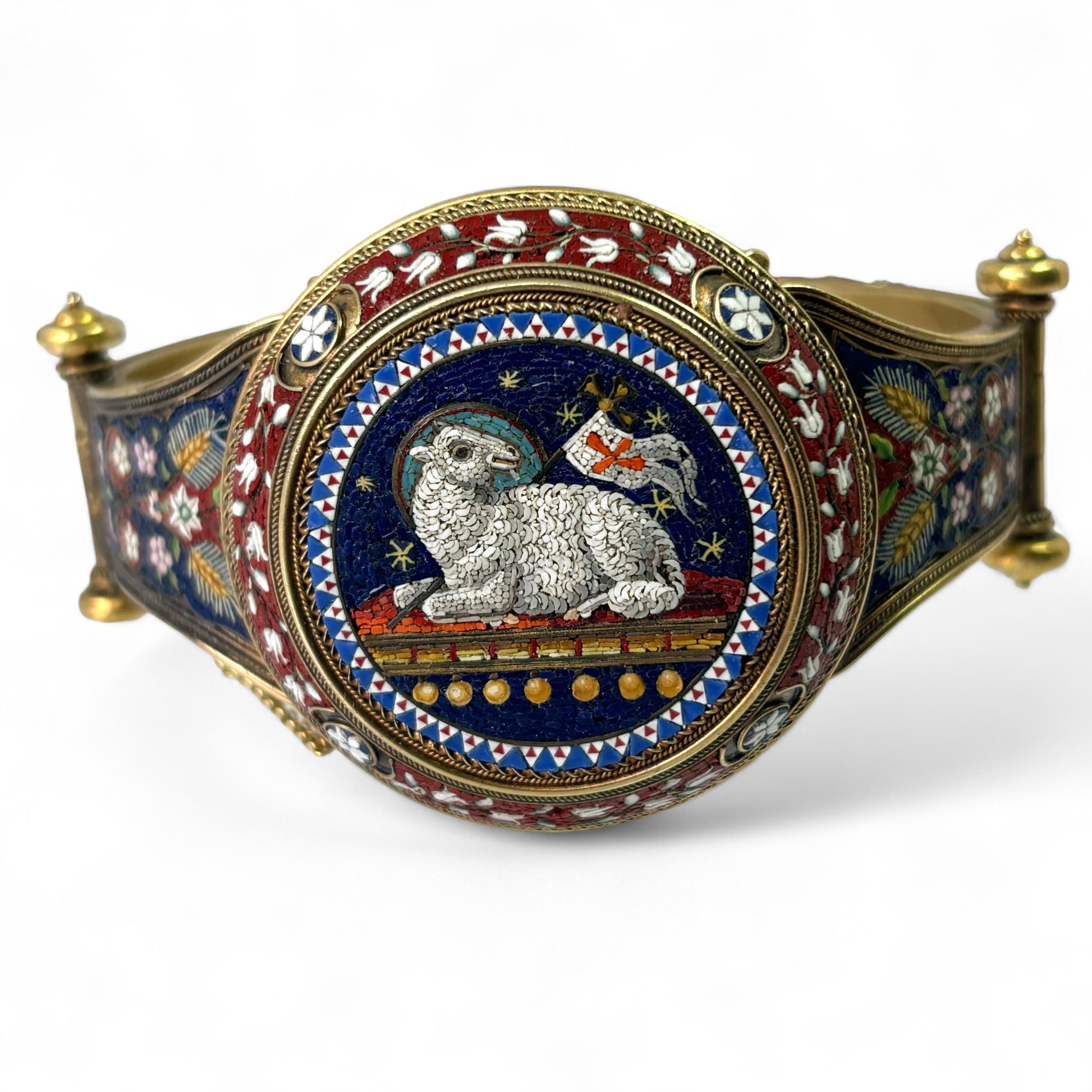 Italian Grand Tour ca 1870 gold bangle with micro mosaic. In later fitted box. Hall marked with the Vatican hallmark.The famous Vatican work shops produced many of the religiously themed mosaics. The bezel is with the Lamb of God. The white doves in the back of the bangle are a reference to the Old Testament story of Noa's Ark, when the dove returned Noa knew the waters have abated.