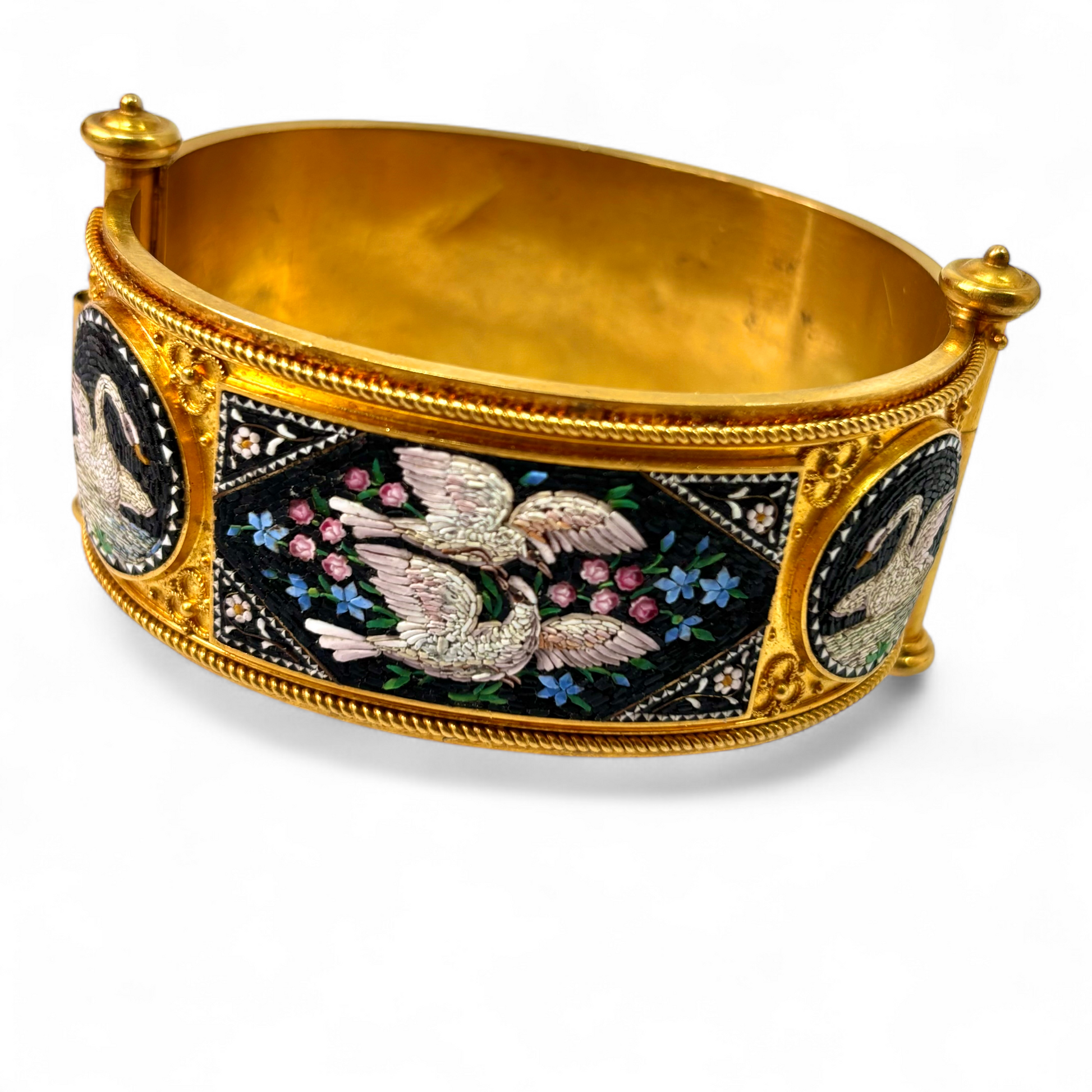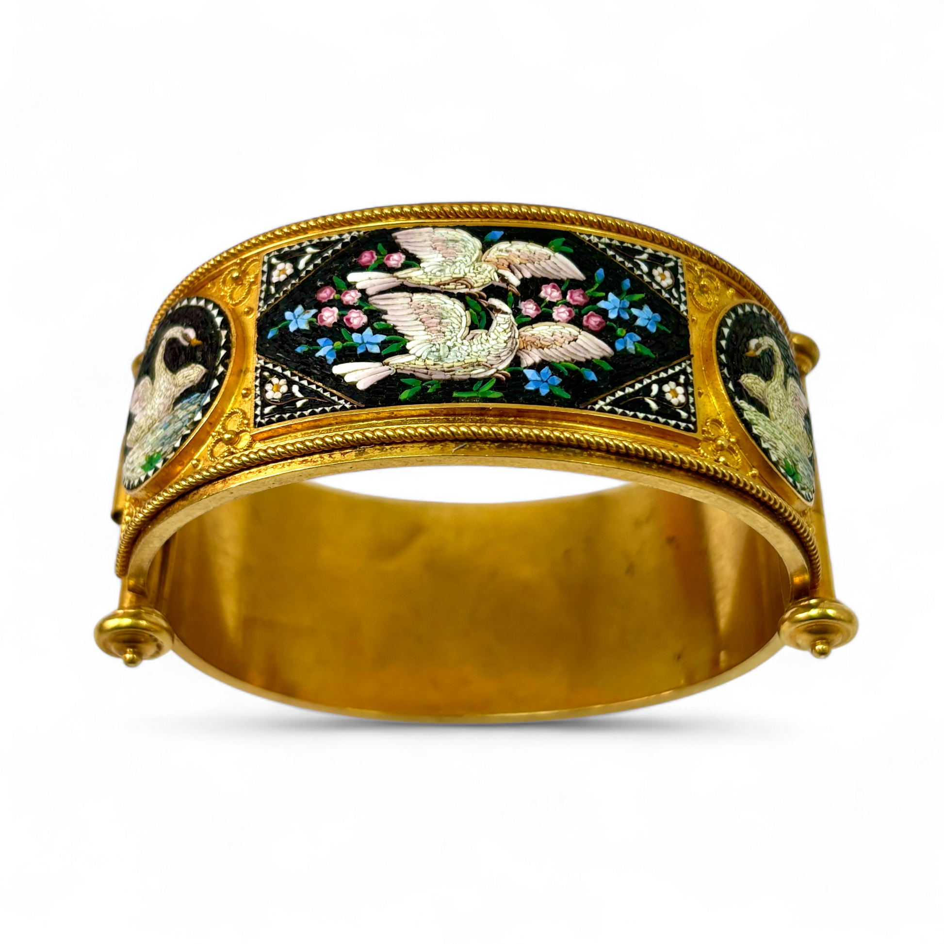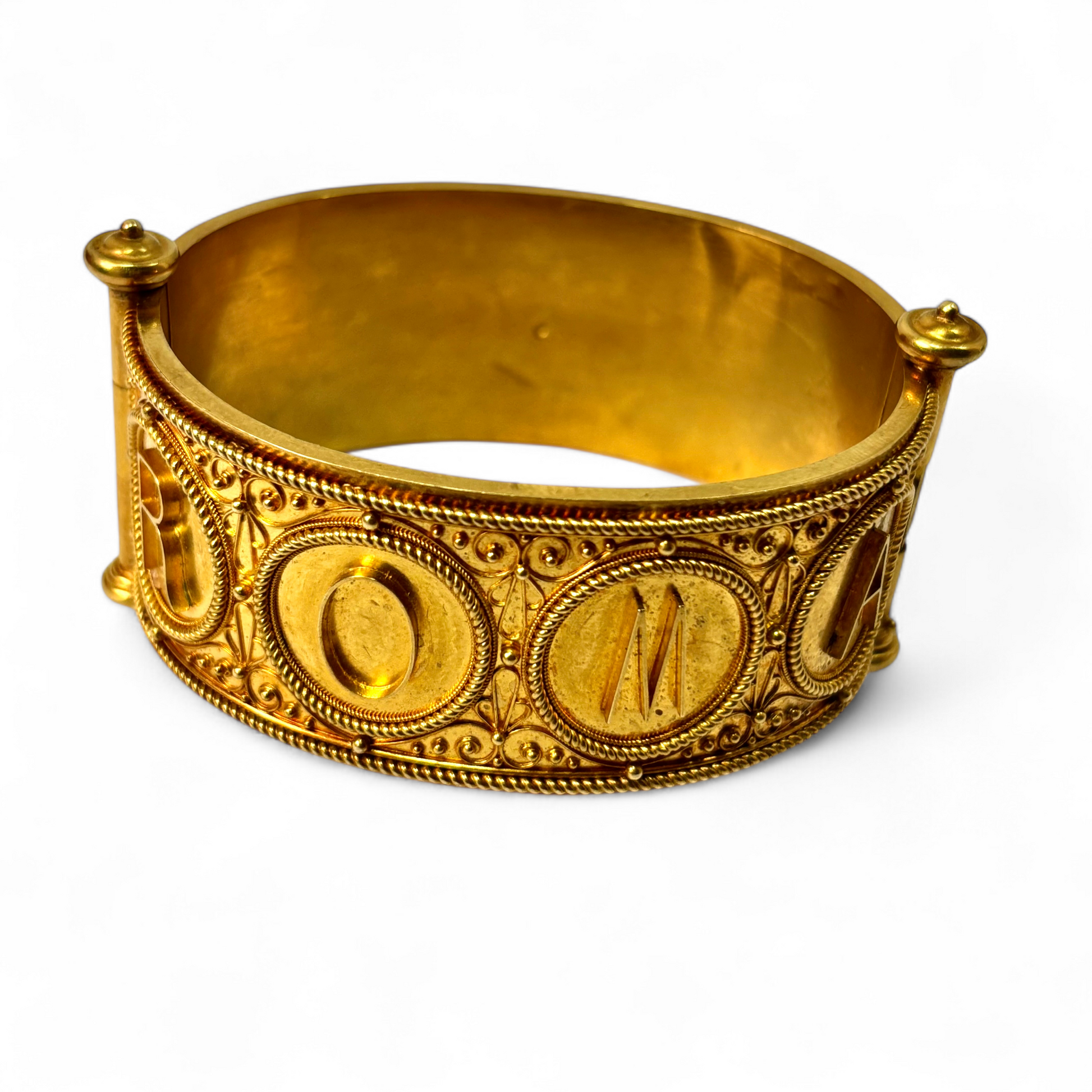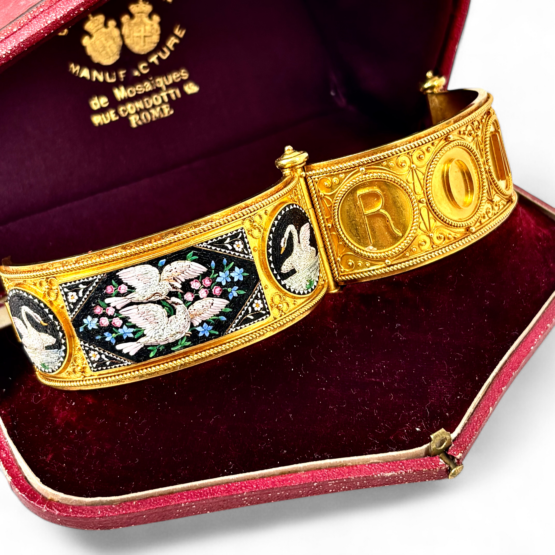 Italian c 1880 Etruscan revival gold bangle in original leather case, with three micro mosaic panels. The hinged bangle is with applied gold letters on the back “ROMA”