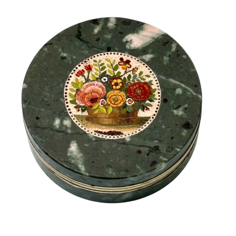Hard stone green serpentine / Porfido Serpentino Verde Prato o Risato / and silver box with micro mosaic inlay. Marked on the silver rim with the makers mark of Giacomo Sirletti 1801-37. In the original green leather box.