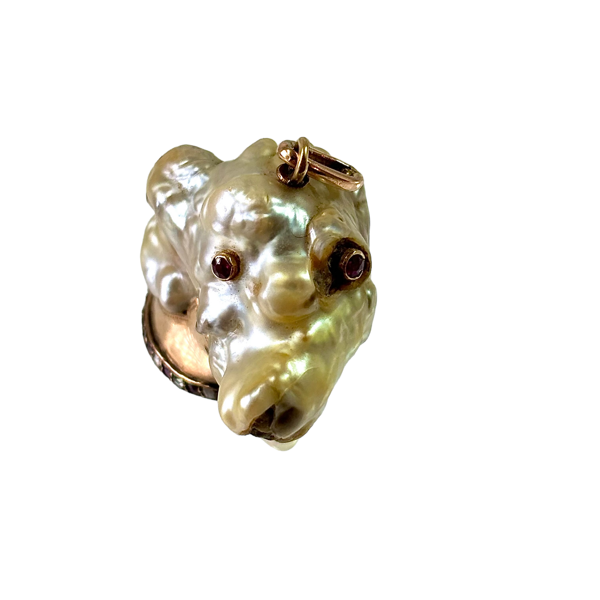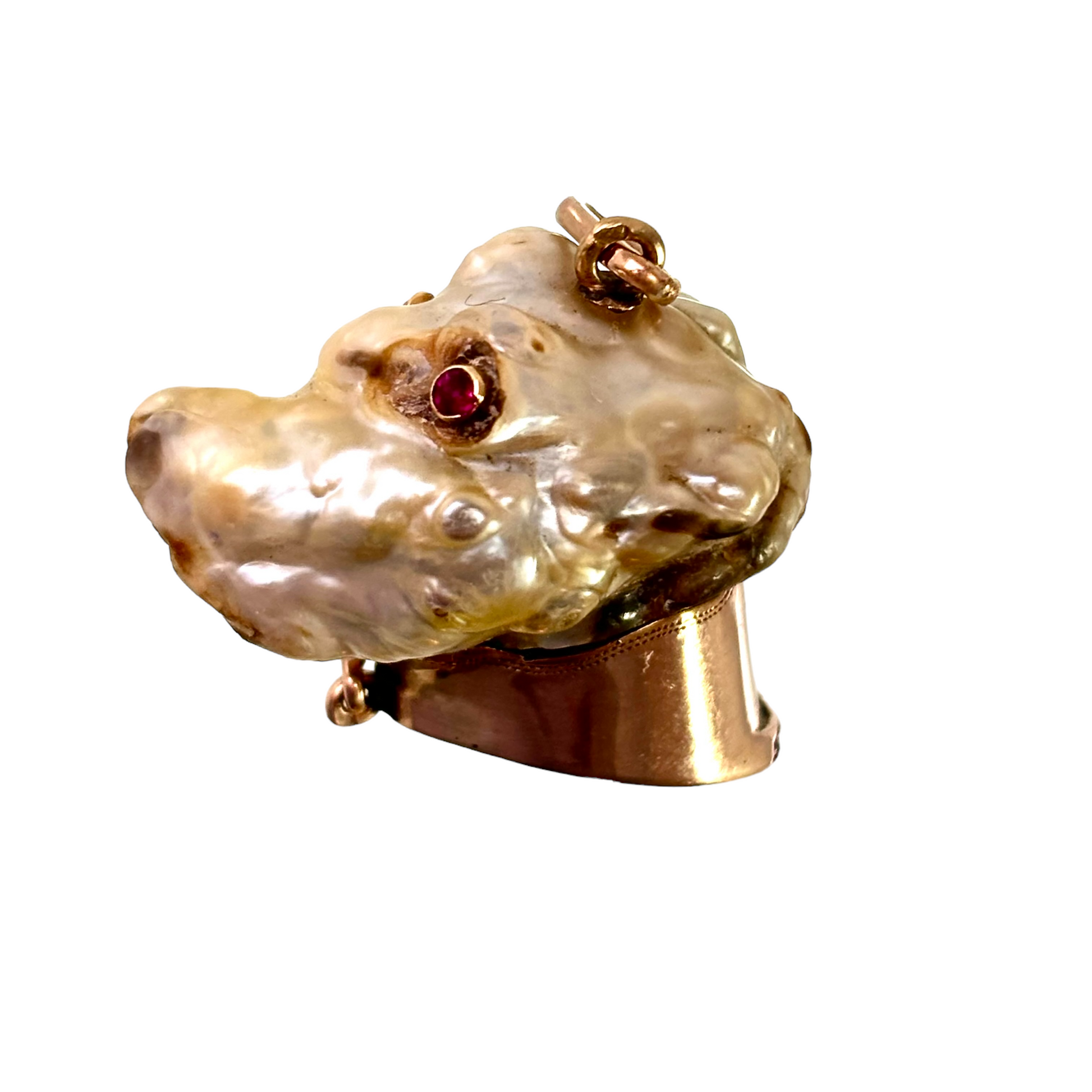 A remarkable natural baroque pearl pendant as a dog’s head with gold mounted ruby eyes and a gold neck set with small diamonds and rubies. Probably French ca 1830-40