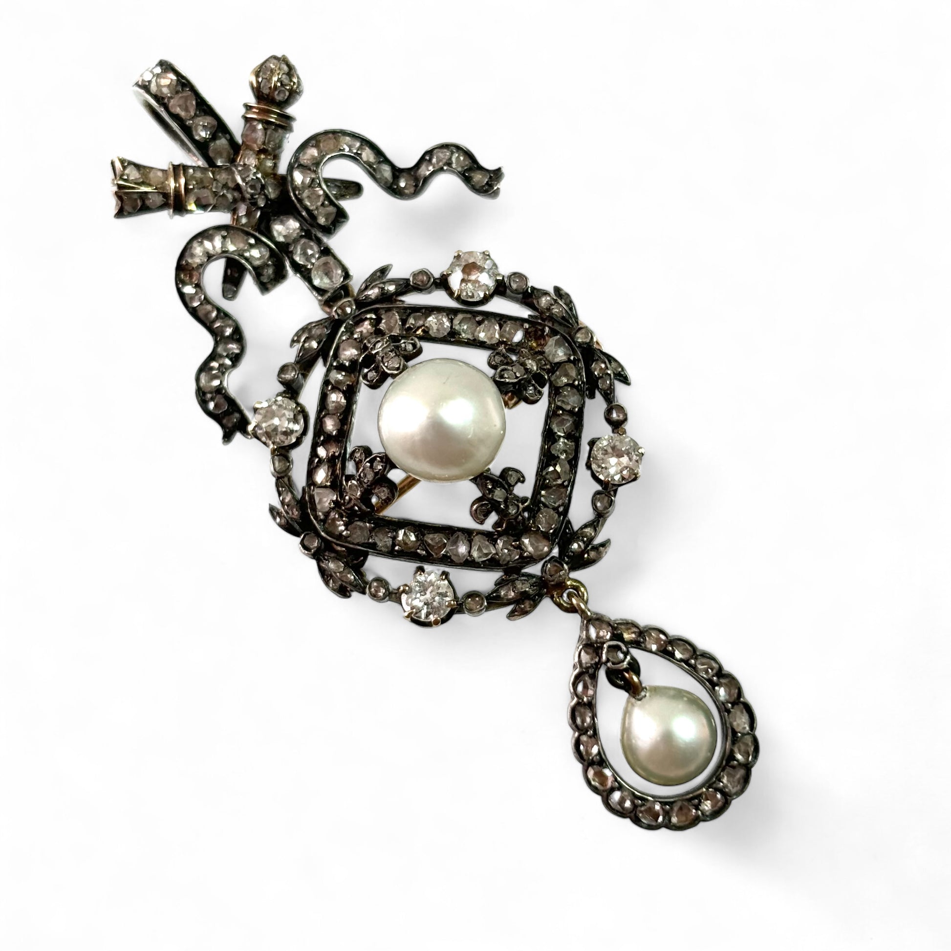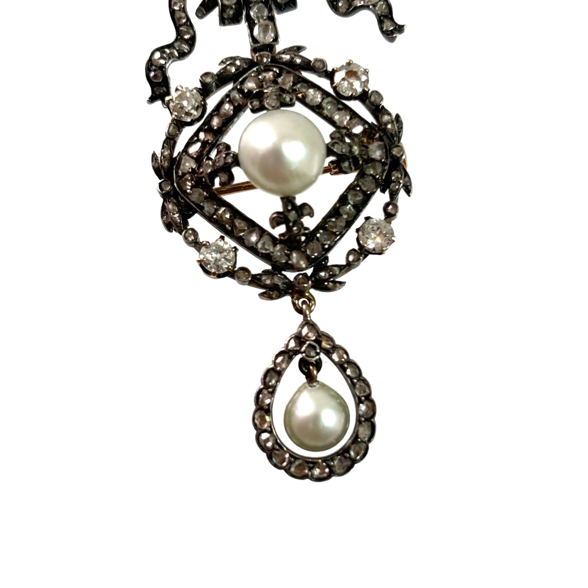 Gold backed silver pendant set with small rose cut diamonds and natural pearls. The pendant has a love theme, on the top part near the bale a quiver and a torch, both are ancient symbols of LOVE. The pendant is with a brooch fitting as well.