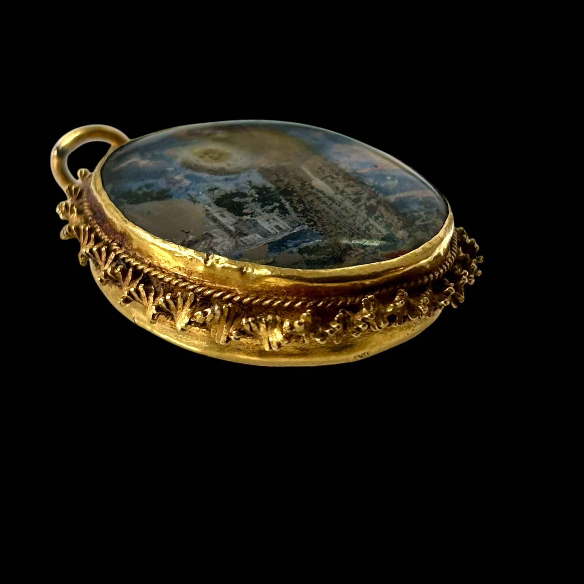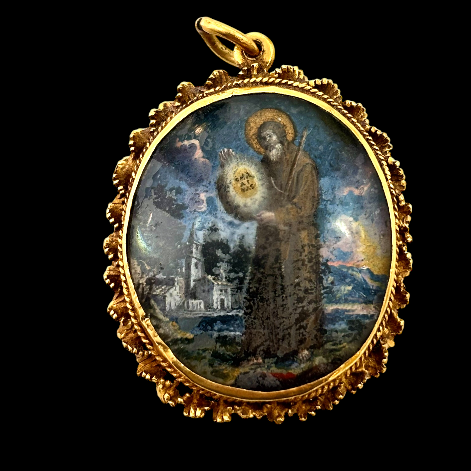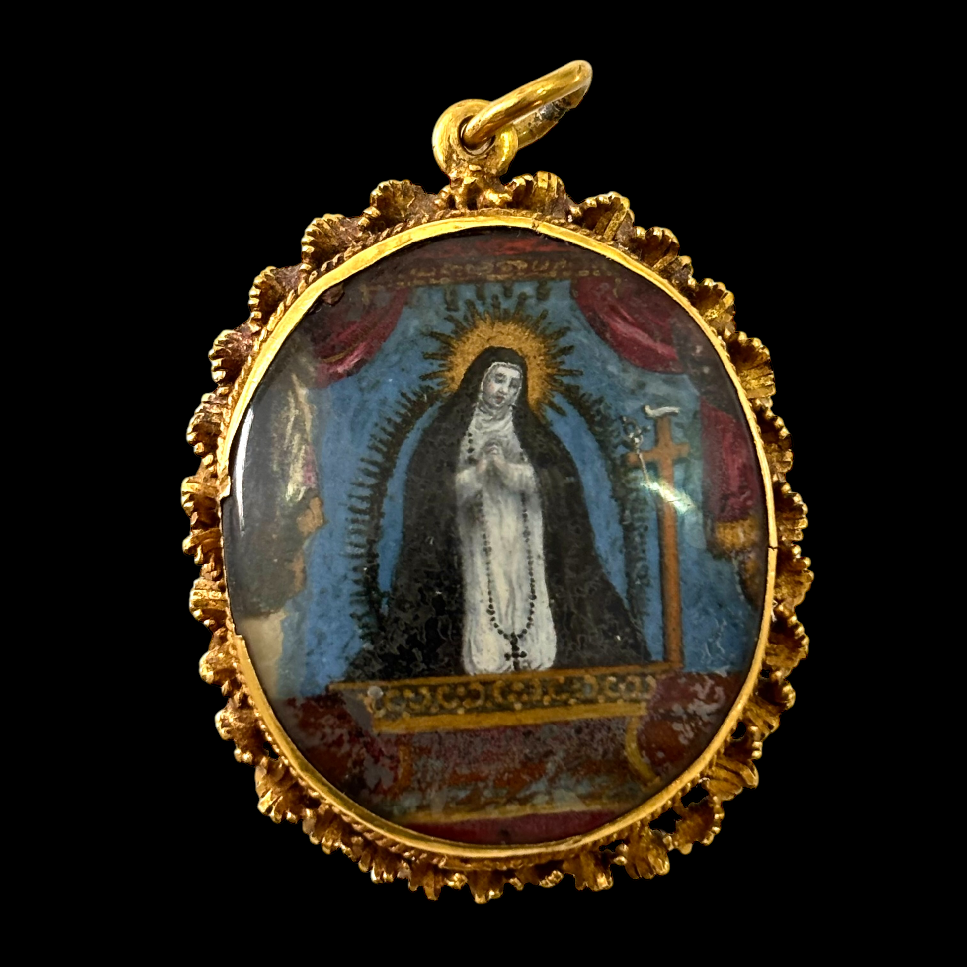 Spanish ca 1660 gold and rock crystal pendant. The pendant is double sided and the image is painted in oil on copper and is under a domed rock crystal. One side is with the image of Our Lady of Guadalupe the other side is of a monk.