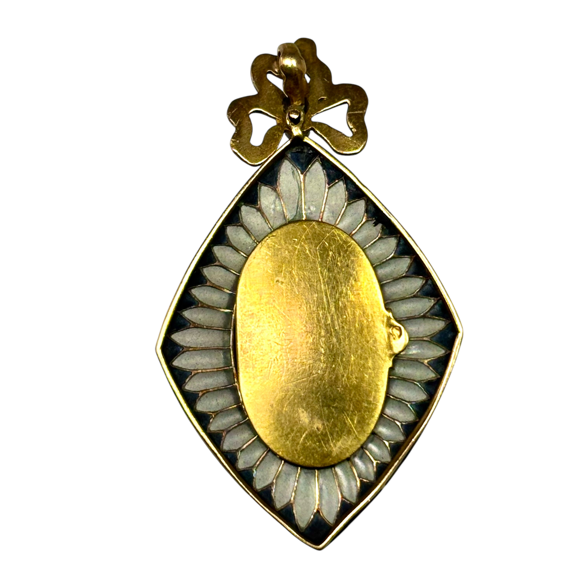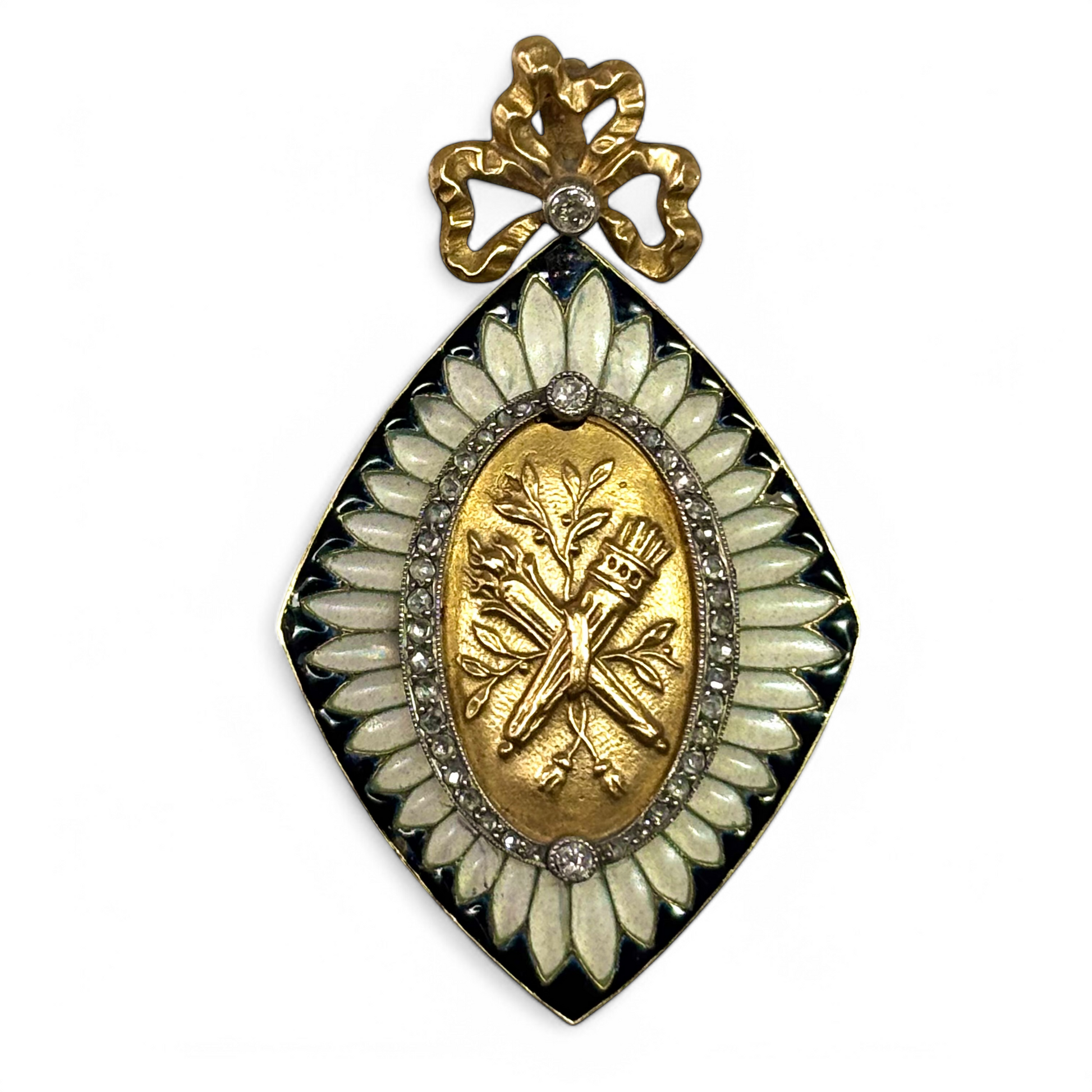 Gold pendant, French ca 1860 with Plique a jour enamel and small diamonds surrounding the central gold panel with quiver and torch / the symbol of love /. The pendant is a locket as well, with a small hinged “door” in the back. In later fitted box.