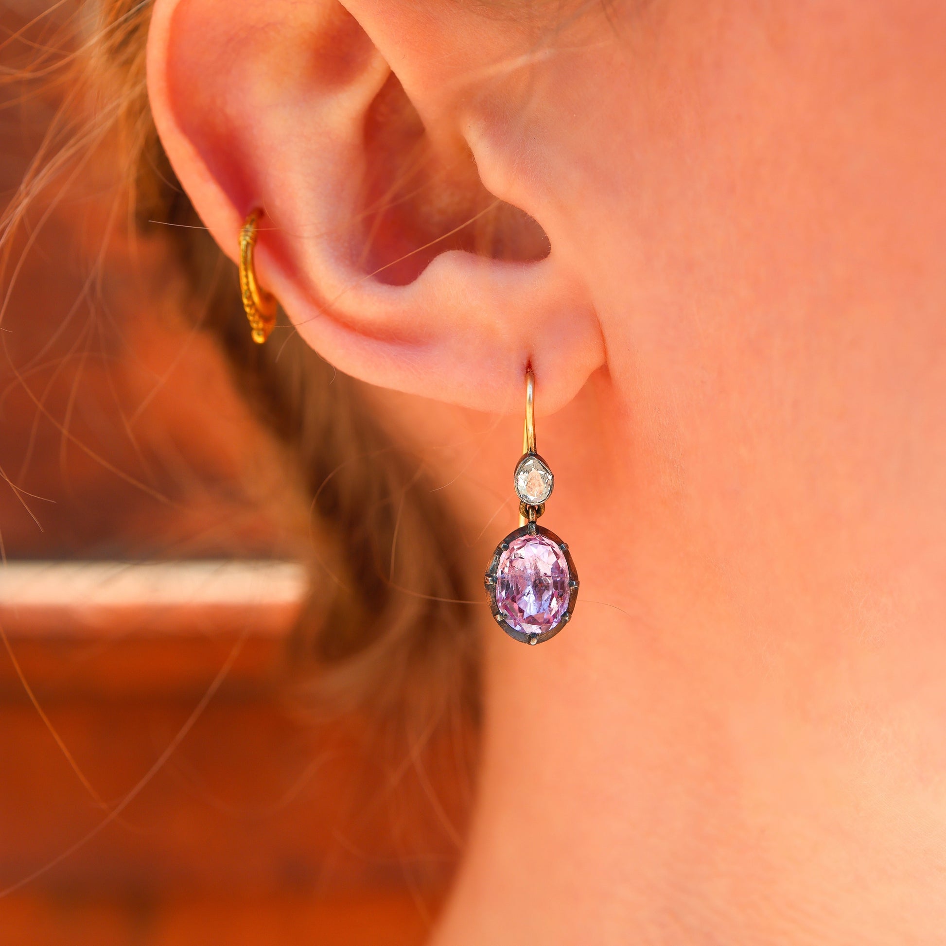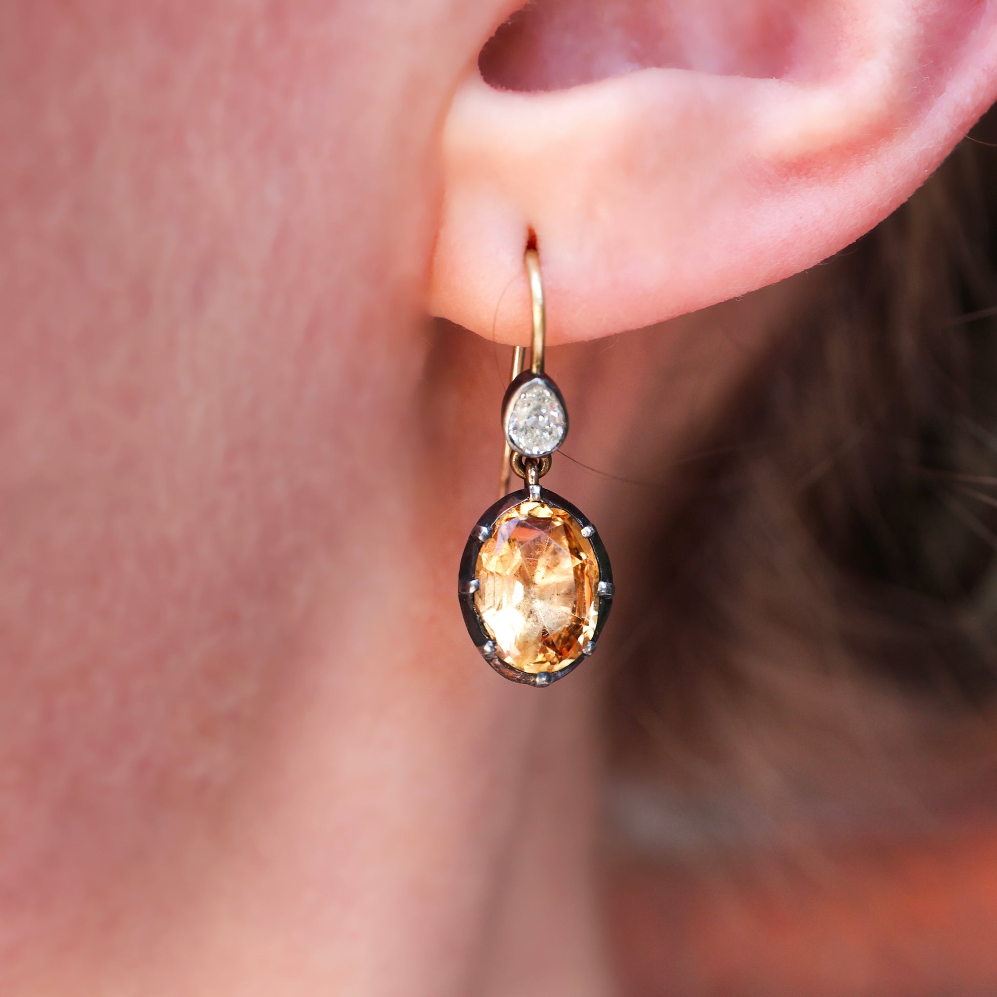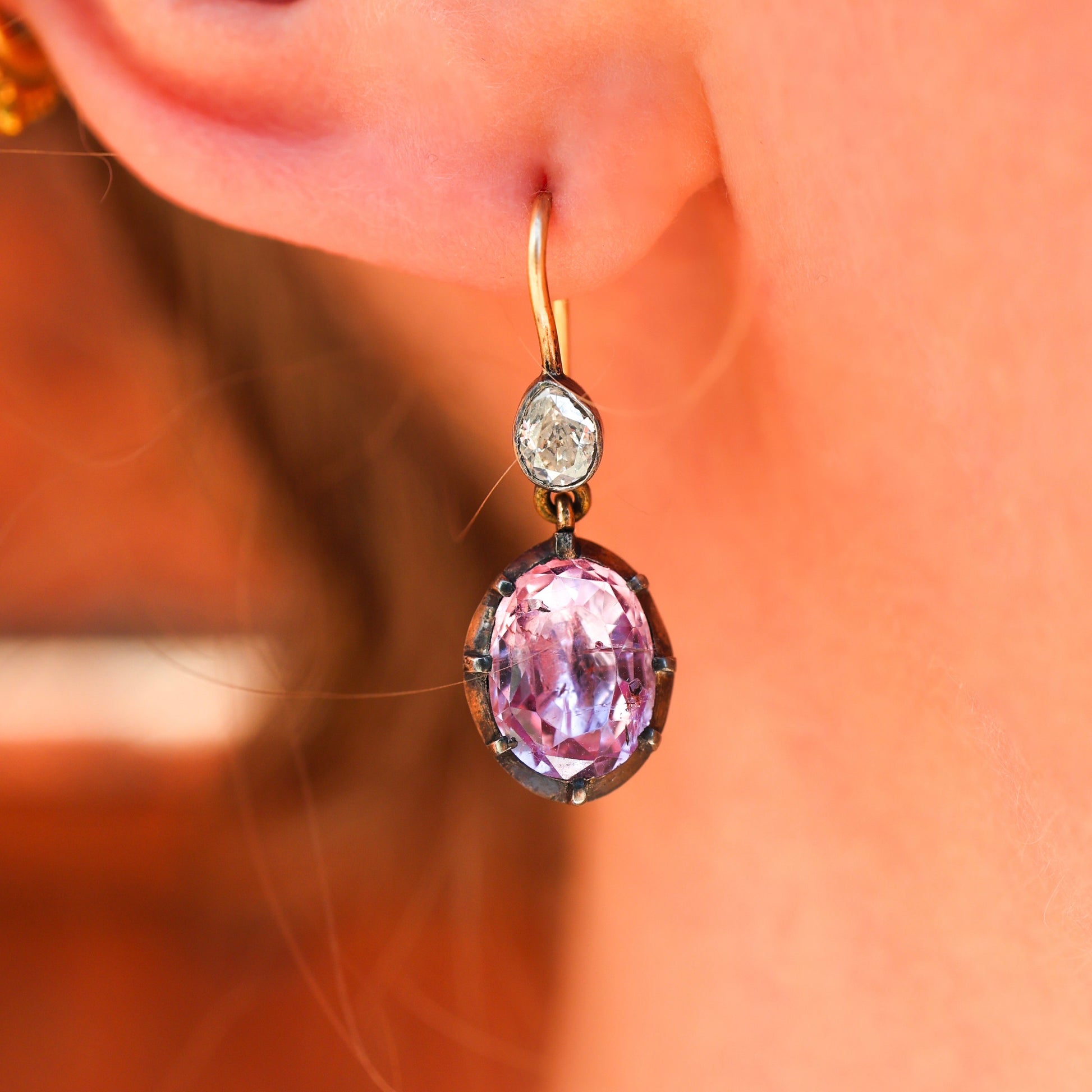 Pair of silver and gold mounted pink and yellow tipaz earrings with drop diamonds.
