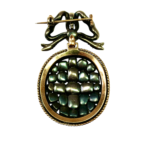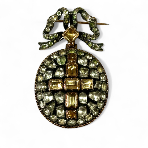 Portuguese ca 1760 silver and gold pendant set with topaz and rock crystal. All the stones are foiled from the back. The gold brooch fitting is later. In fitted box.
