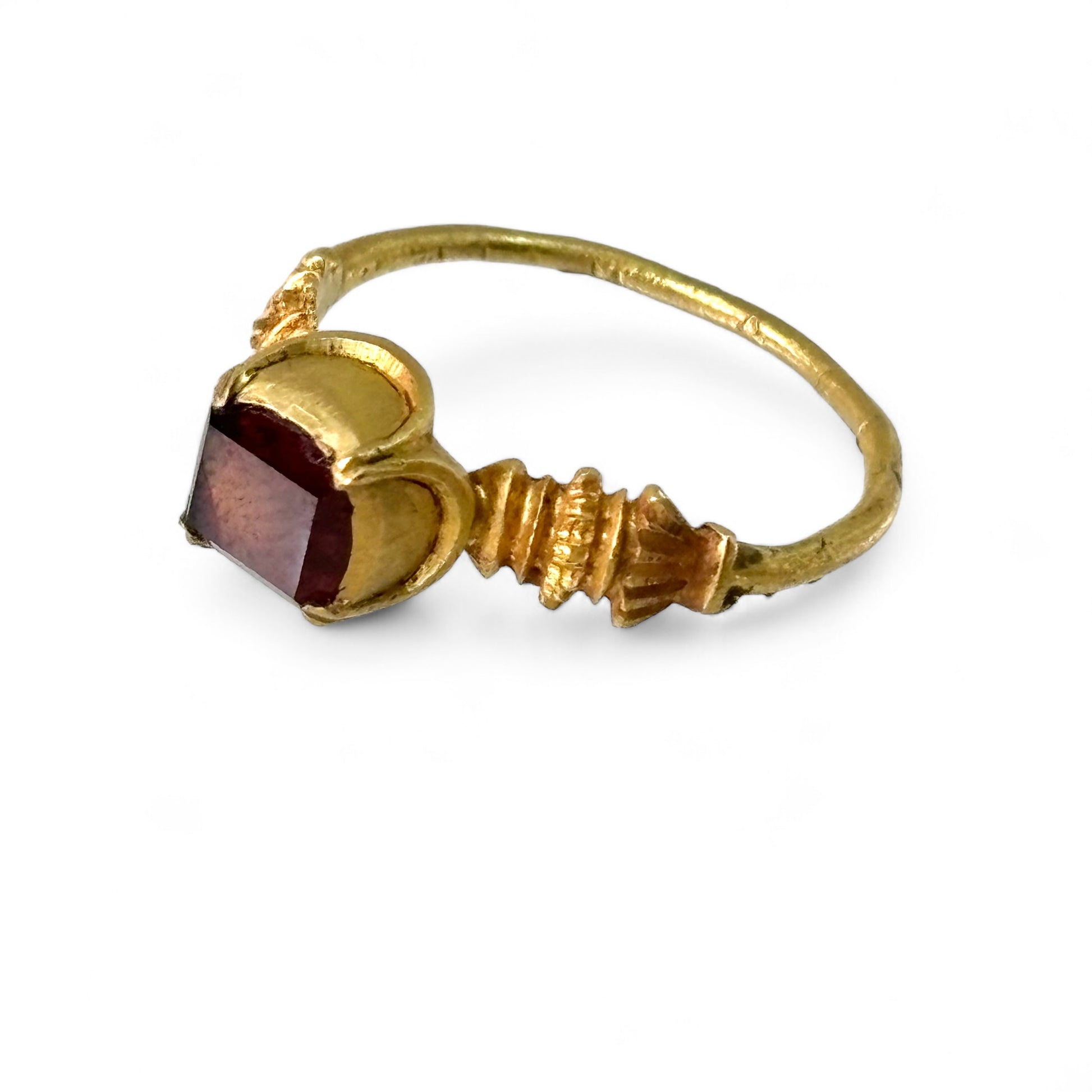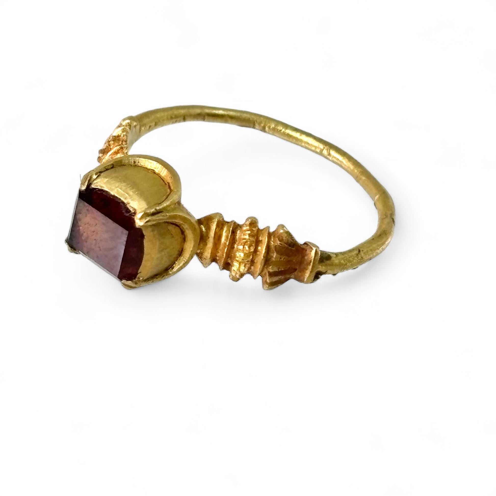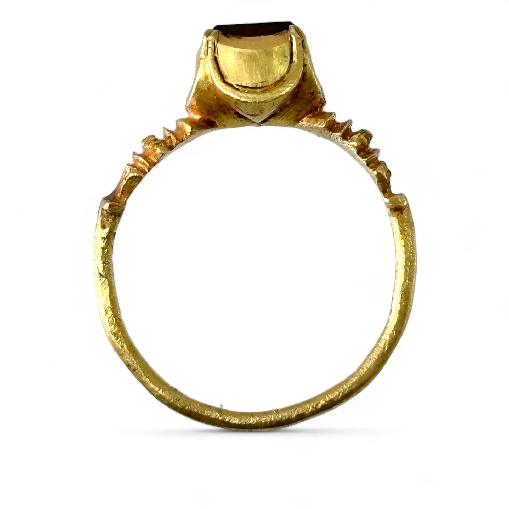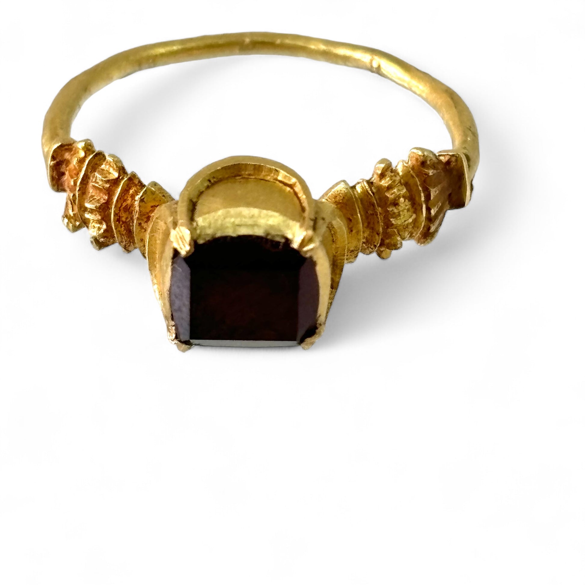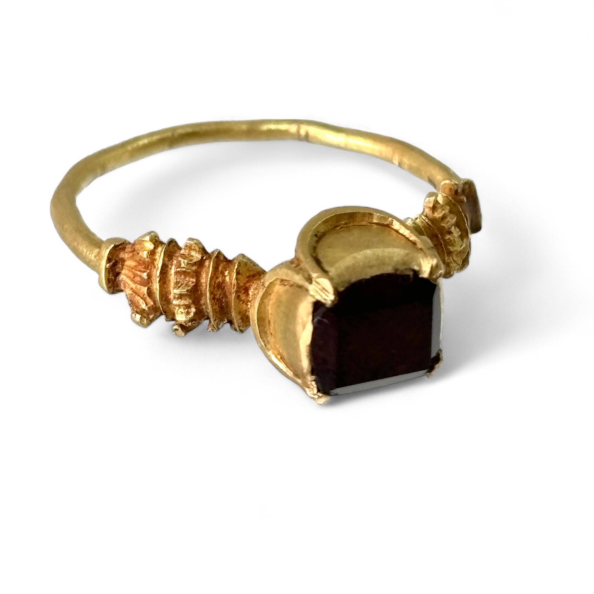 Renaissance gold ring with table cut oblong garnet, England ca 1550 . Normally these rings are enamelled but this example has never been.