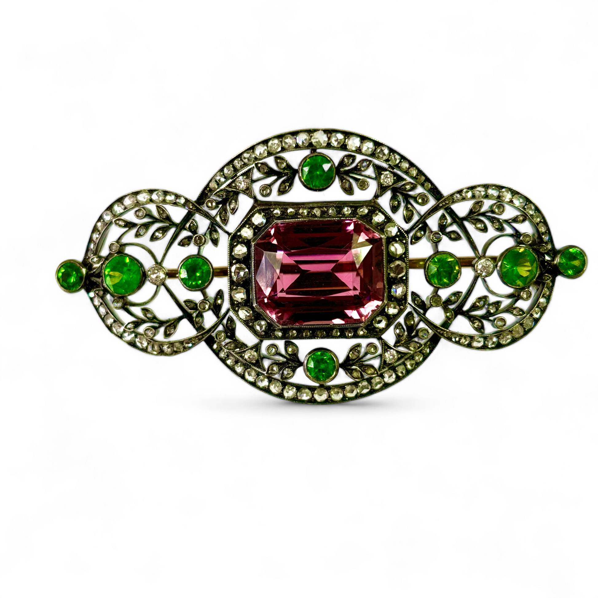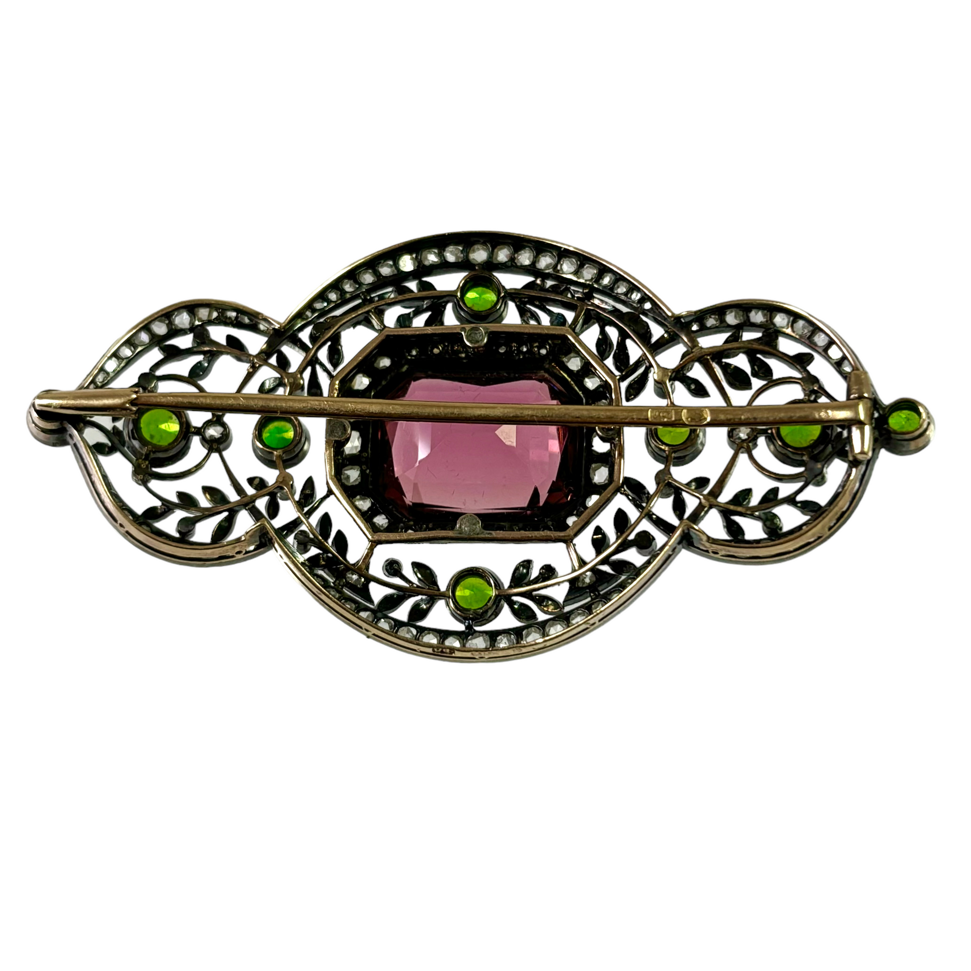 Gold and silver brooch, set with a pink tourmaline in the middle, also with eight Russian green garnets, and small diamonds. Fully hallmarked with Russian hallmarks and makers mark “FL” in Cyrillic letters.