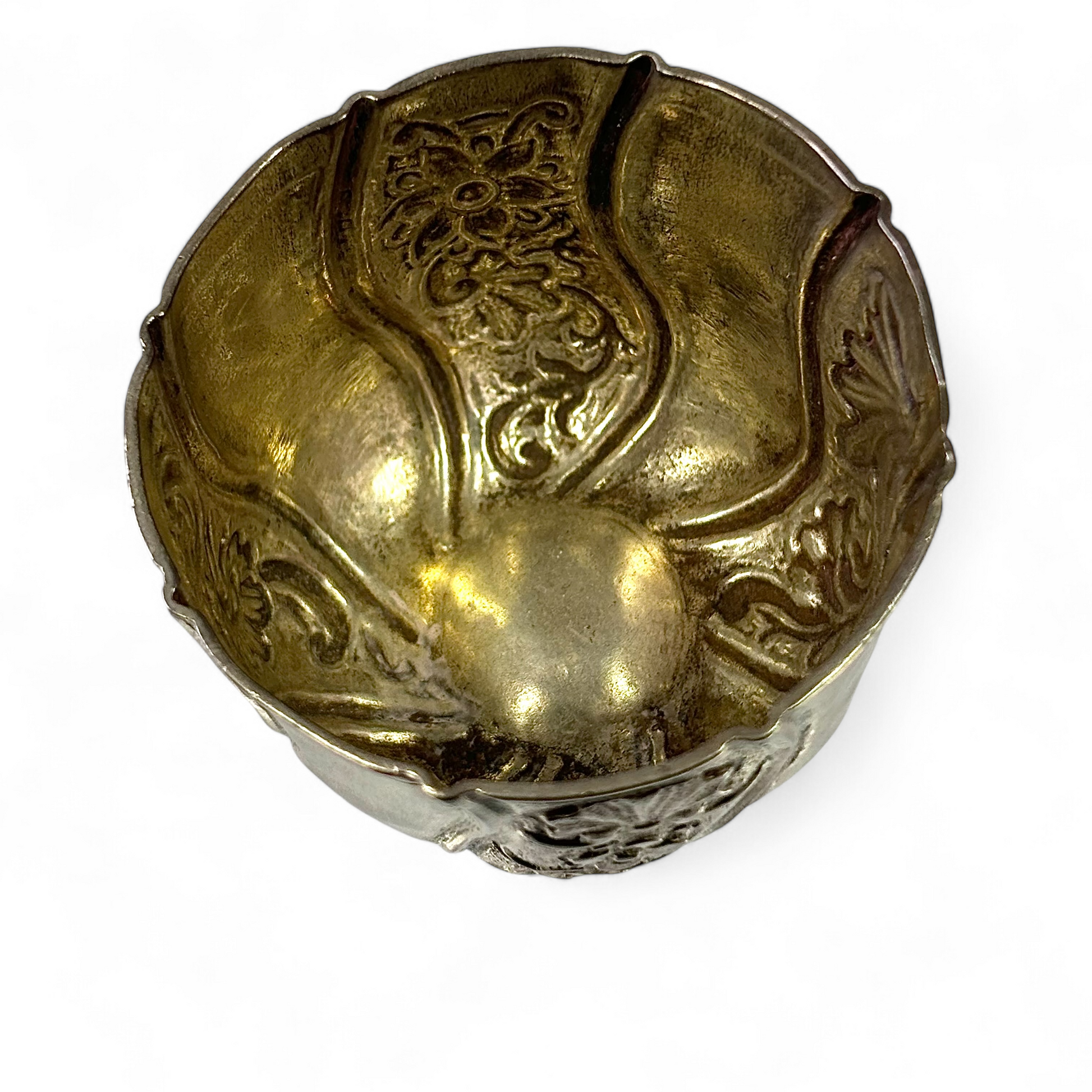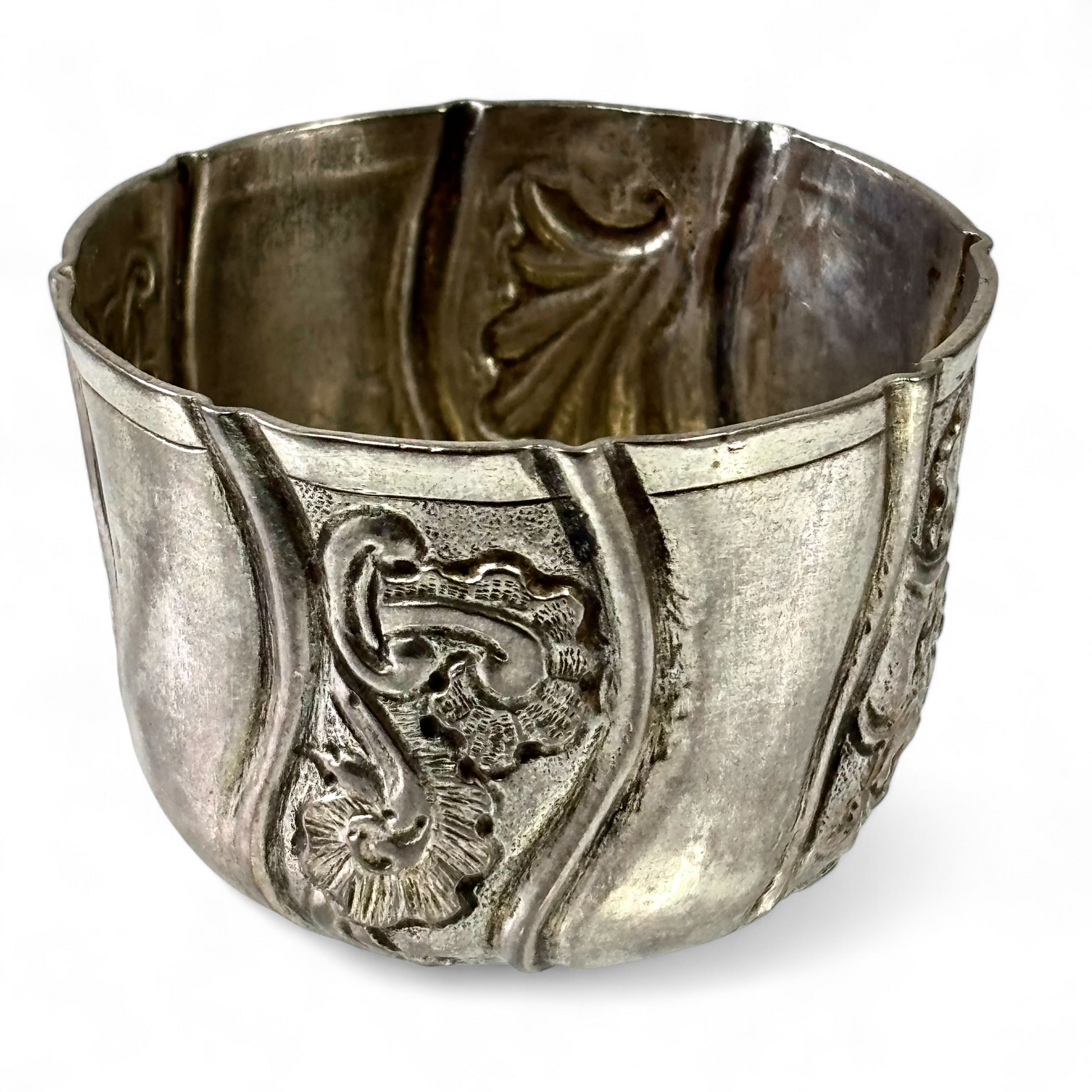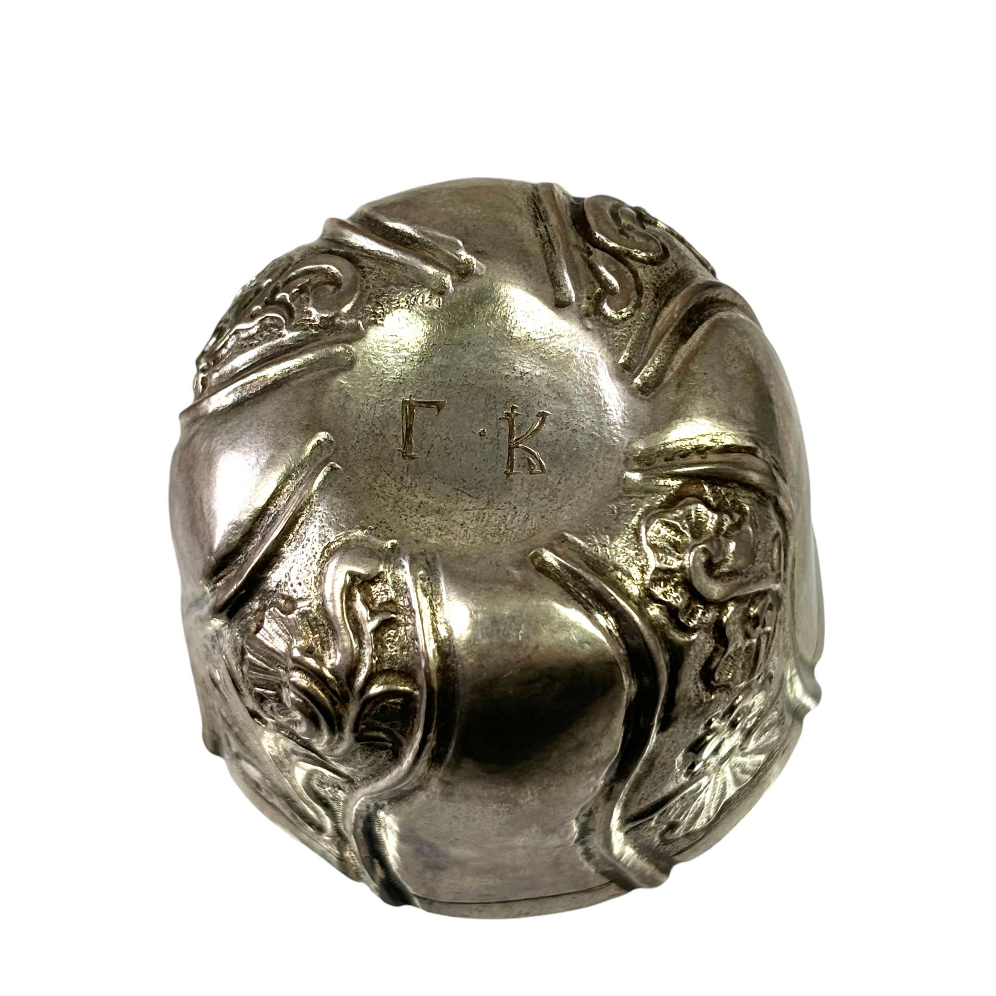 Unmarked Russian silver vodka cup with rococo chased decoration. The underside is with a Russian Cyrillic engraved monogram. Russia ca 1760-70