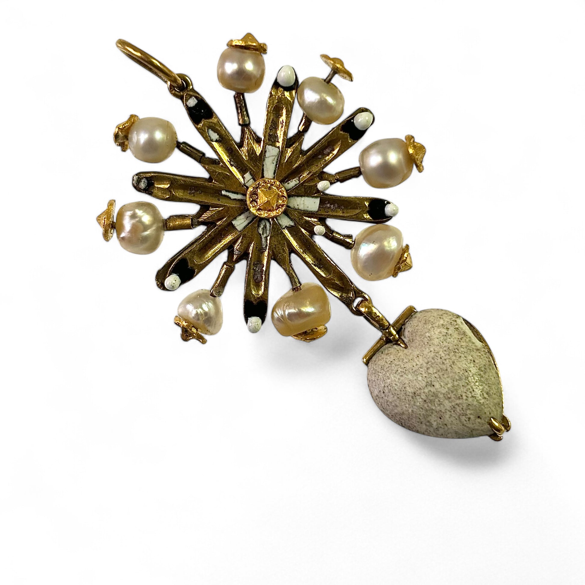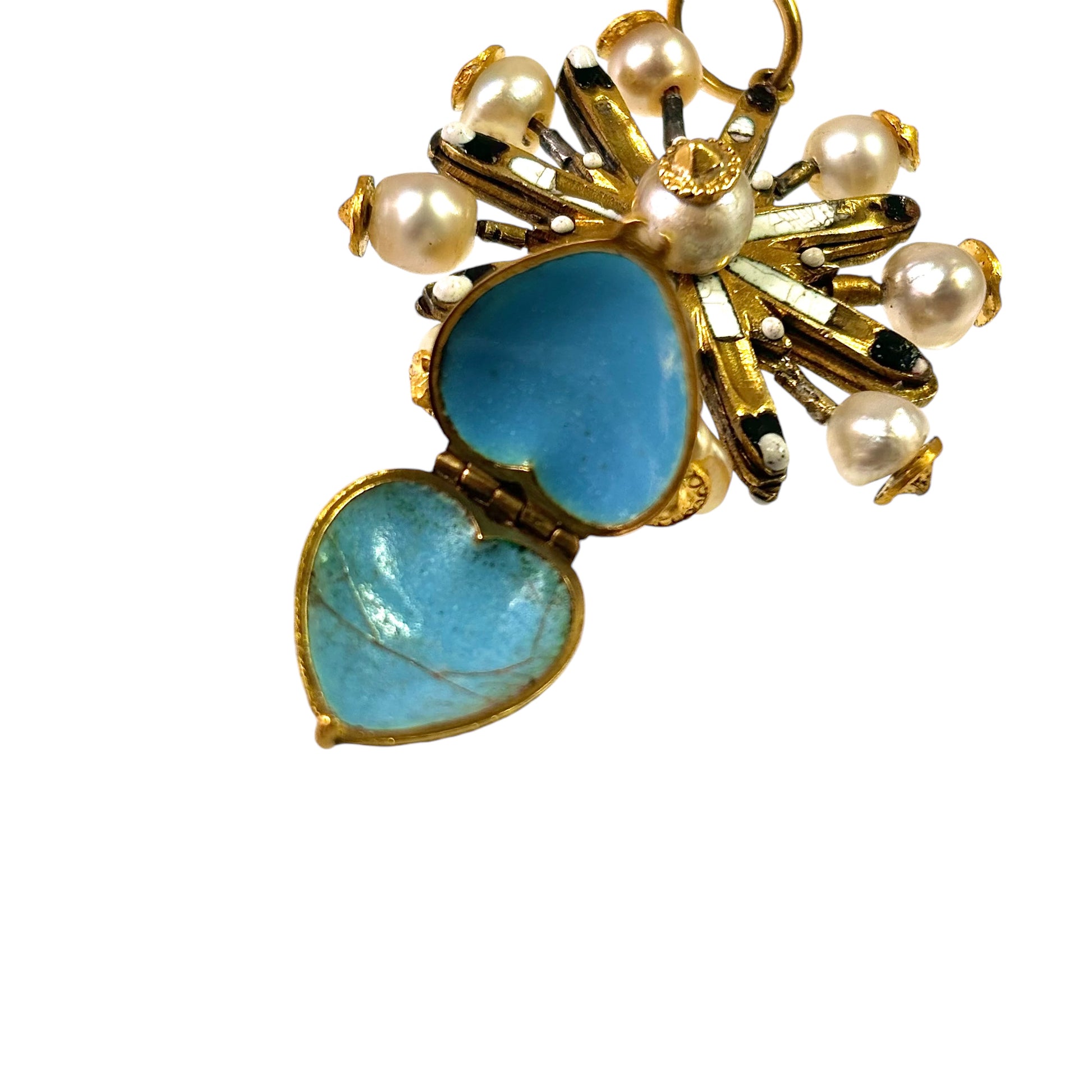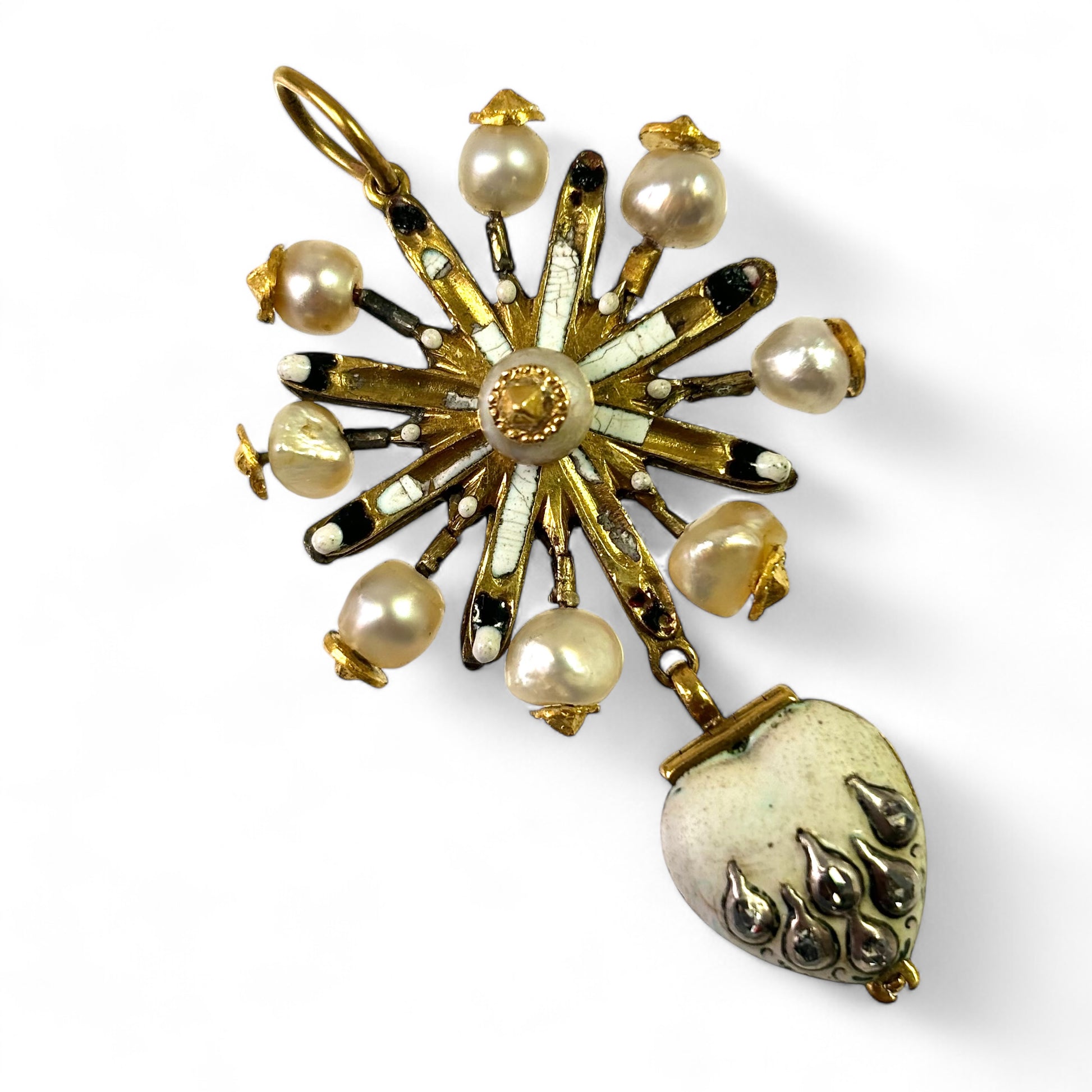 Probably Spanish ca 1600 enamelled gold devotional pendant with natural Pearls and small diamonds, representing the “ sacred heart” . The heart opens , its enamelled on the inside.