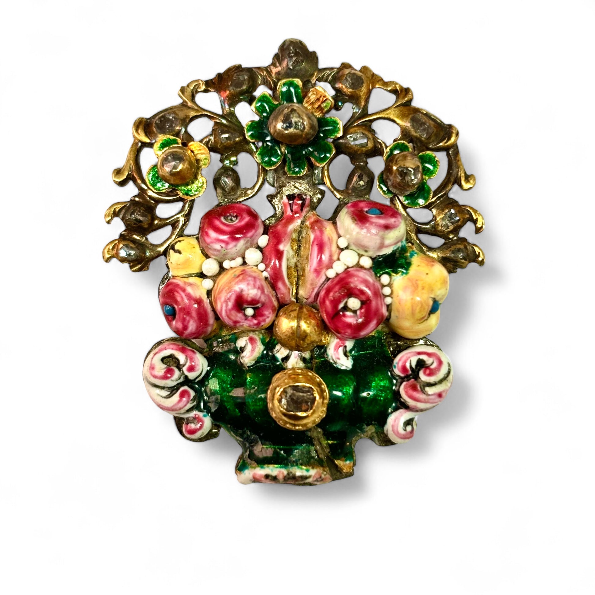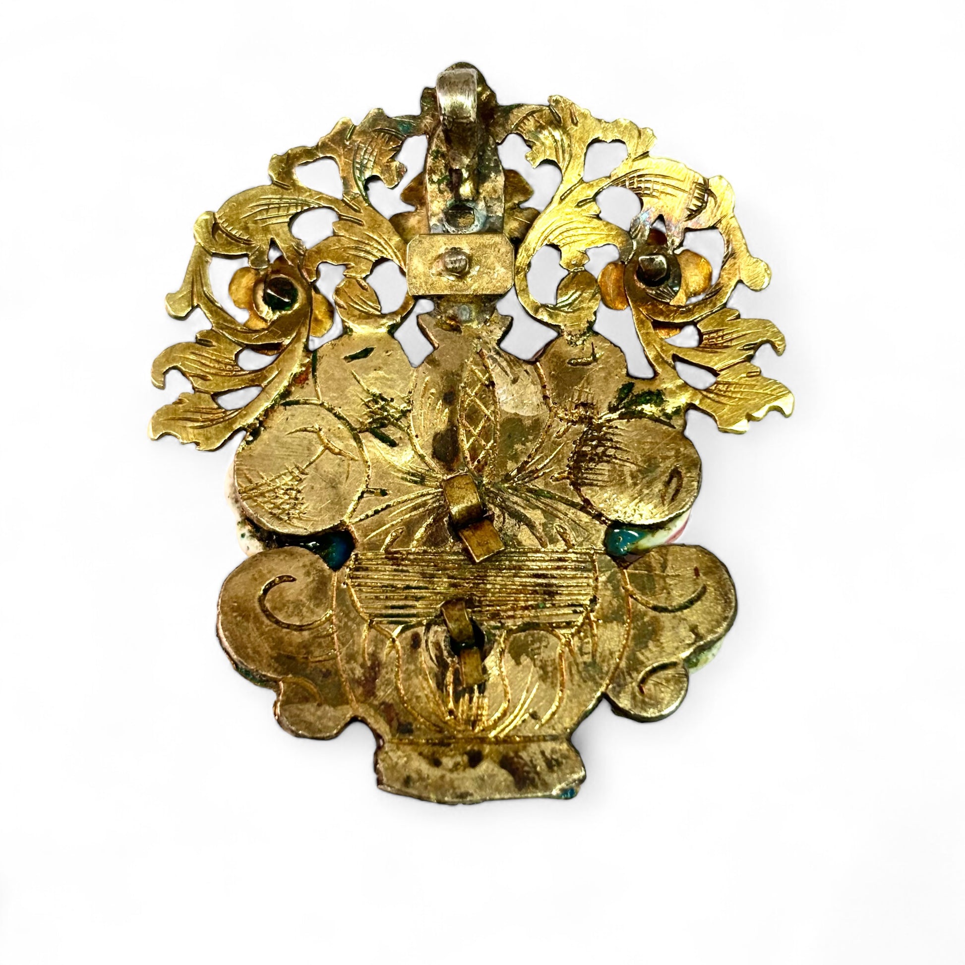 Italian ca 1650 enamelled silver gilt pendant set with small rose cut diamonds. The back of the pendant is engraved.