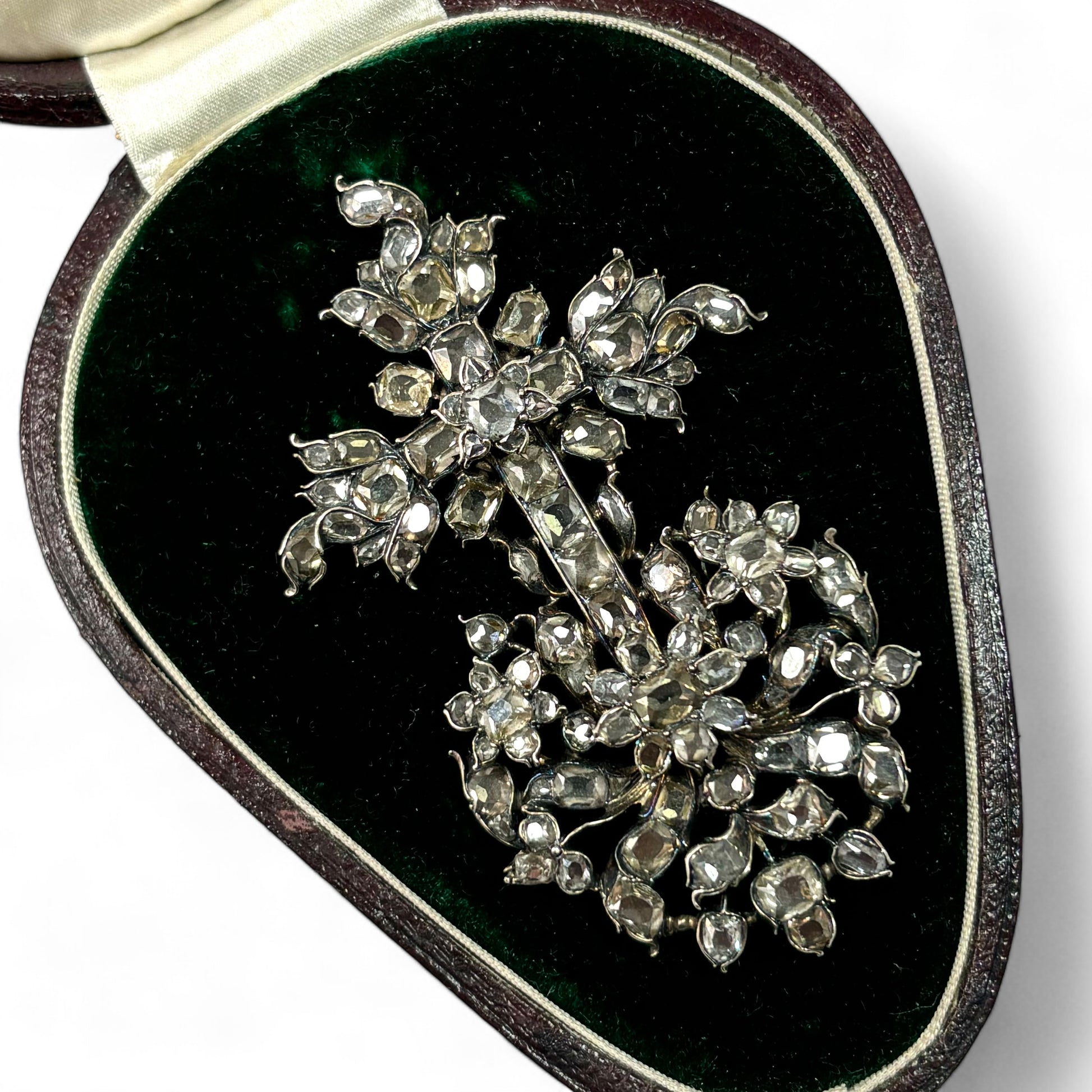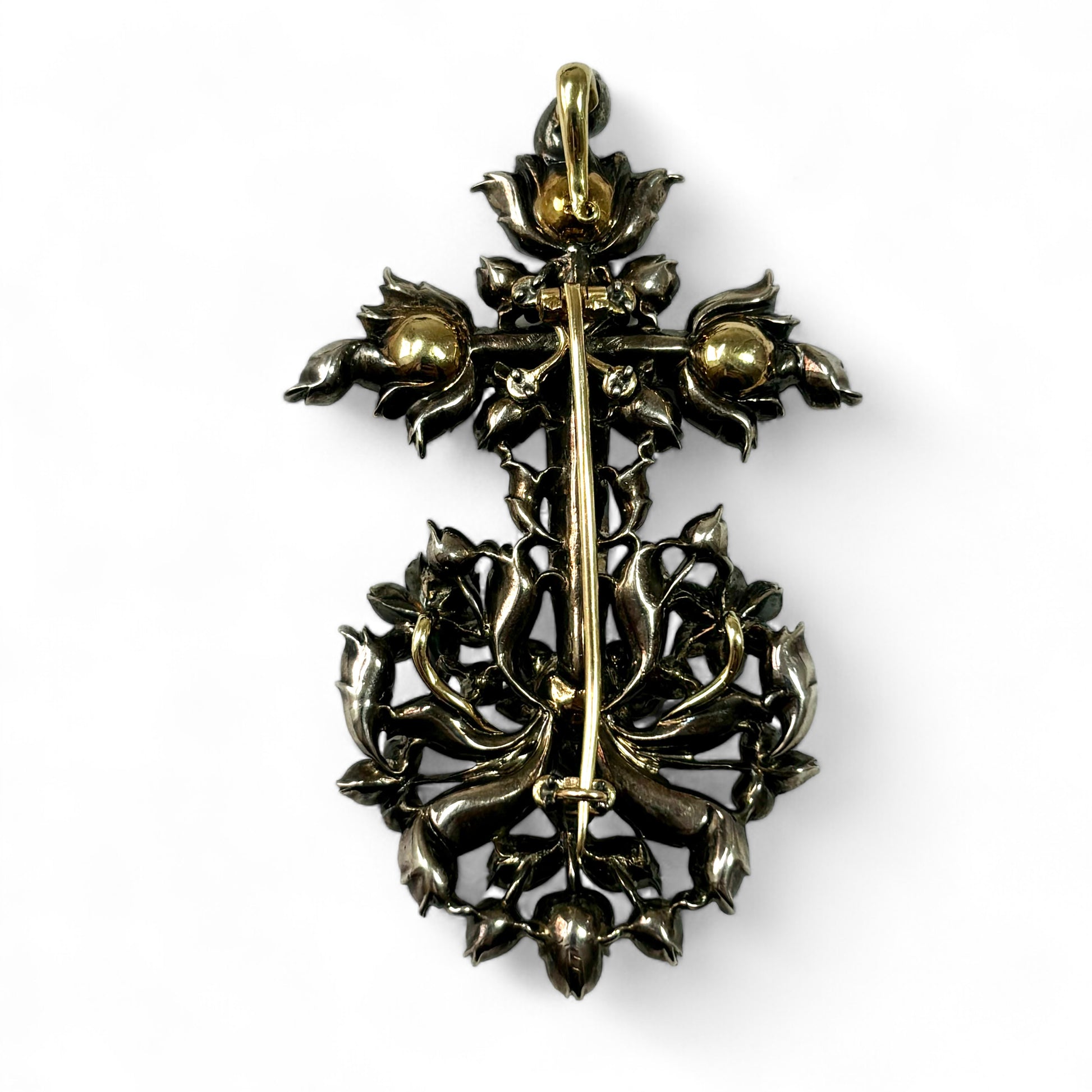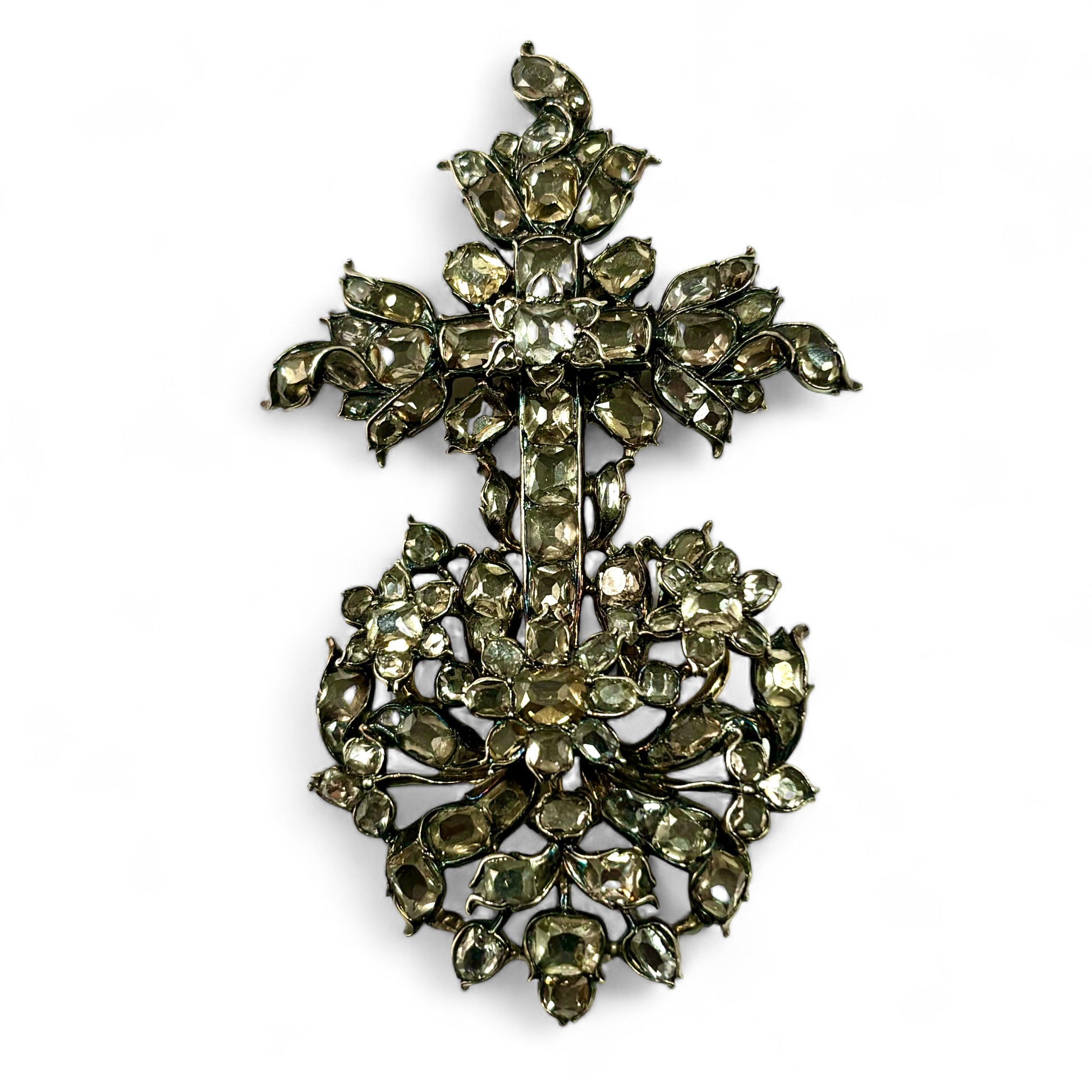 “Large “ silver cross, probably Spain ca 1700 set with full cut diamonds.The gold brooch fitting in the back of the cross is a later addition. In later ca 1860 fitted box.