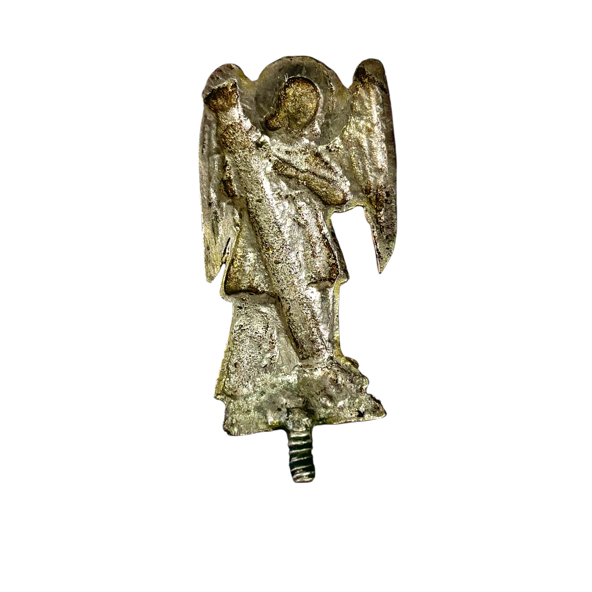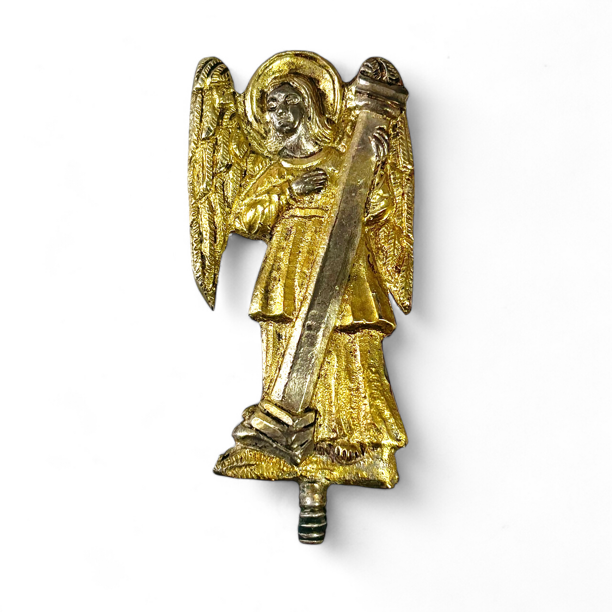 Small partially gilt finely modelled and chased cast silver winged Angel holding a column. Probably France ca 1500. It might have been part of a processional cross.