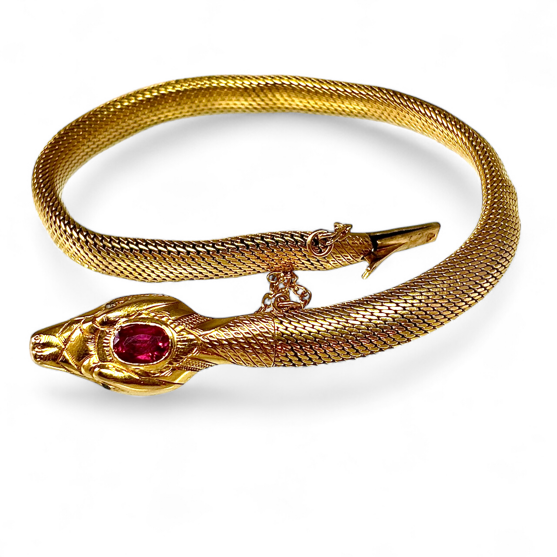 Late nineteenth century French ca 1880 eighteen carat flexible snake bracelet with a Burma ruby set on the naturally modelled head of the snake.